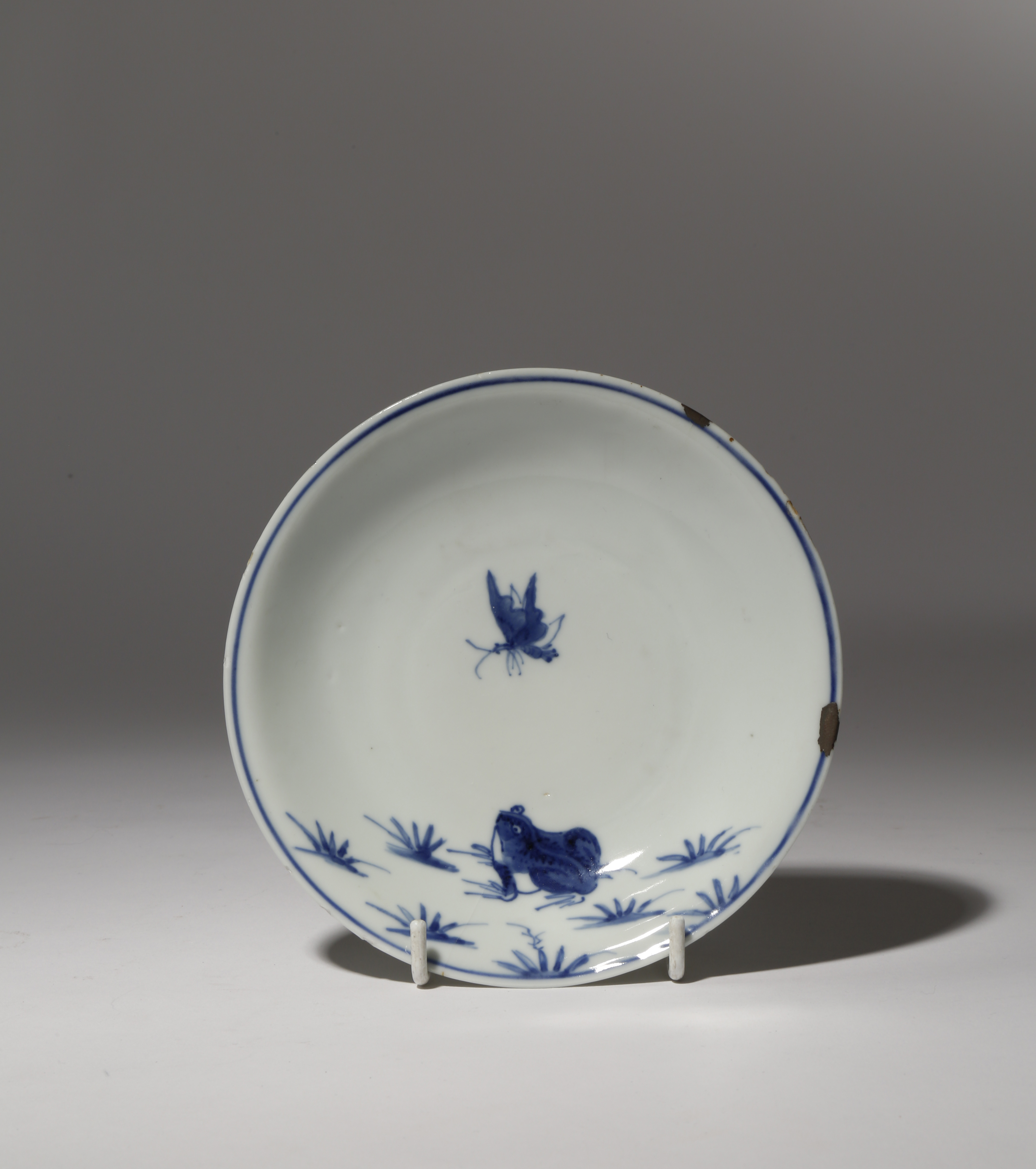 Decorated in underglaze blue with a large frog amongst grasses, the amphibian looking up at a butterfly fluttering above it; the rim with silver kintsugi lacquer repairs, the underside with three sacred pearls and dots, 14.9cm.
