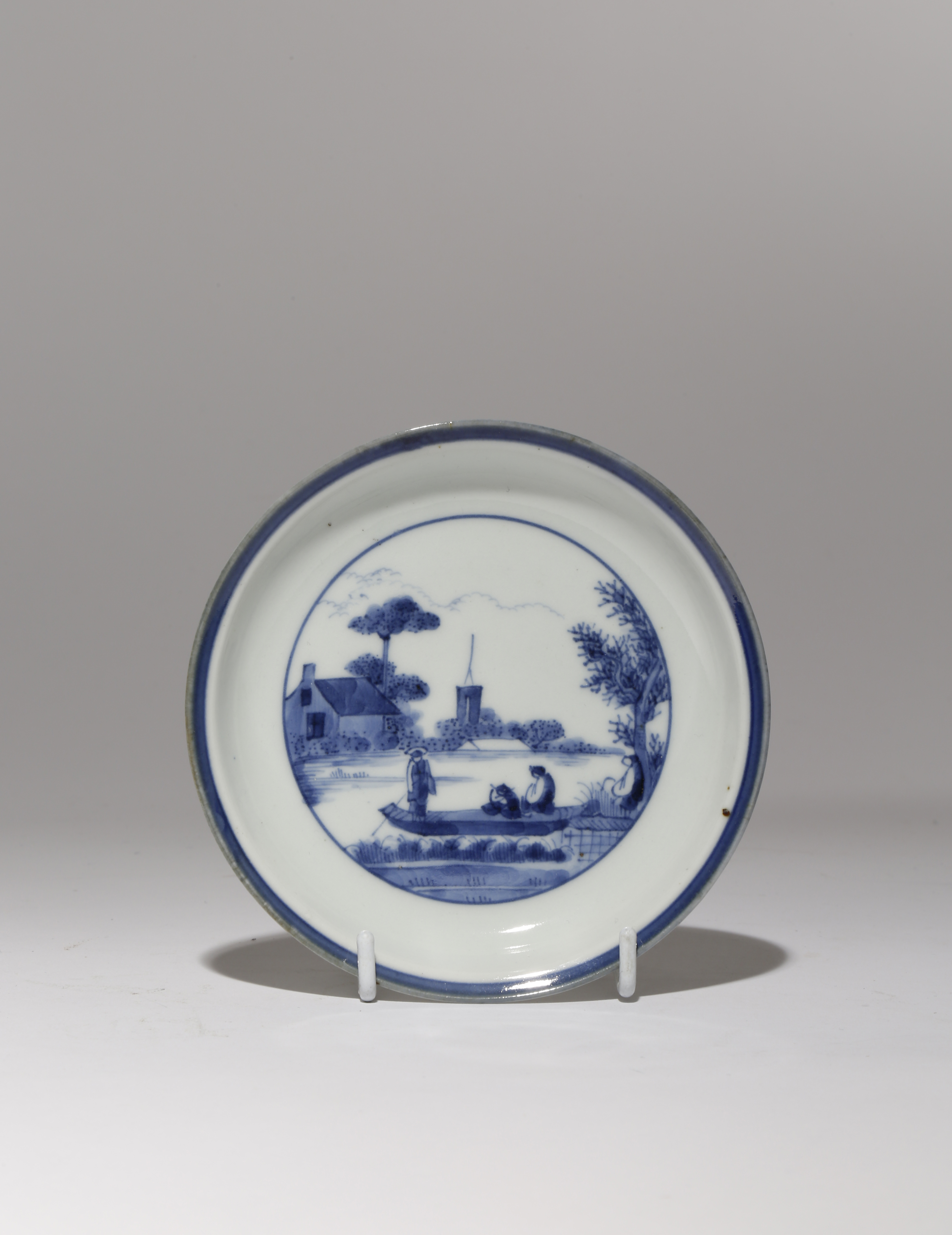 Decorated in underglaze blue, the well painted with a rural scene of European-style figures in a small boat, with houses by the water edge in the background, the underside with a Chinese mark for Da Ming Chenghua nian zhi, 12.8cm.