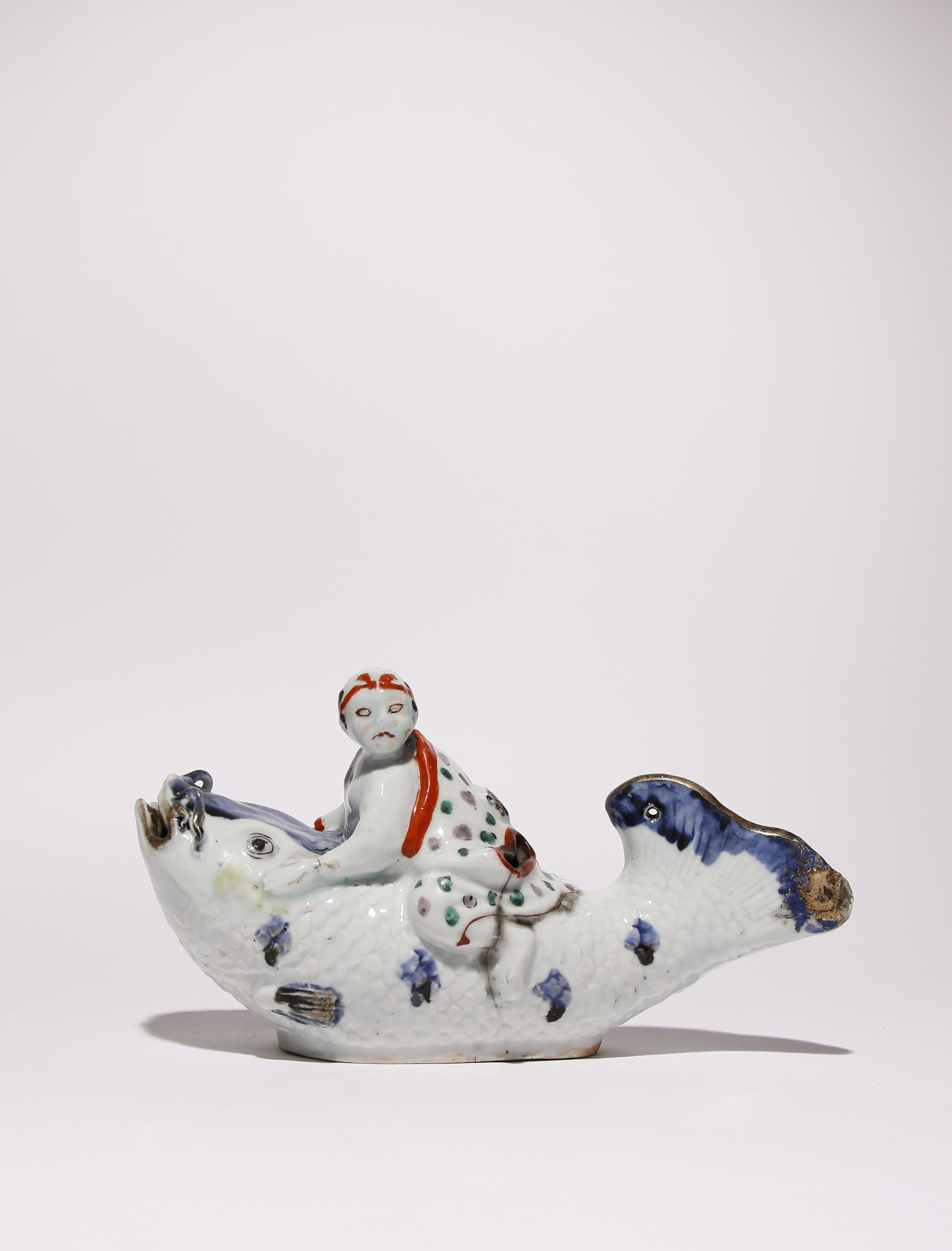 See the Ashmolean Museum, Oxford, access. no.EA1978.447 for another example. Also, see the Princessehof Ceramics Museum, Leeuwarden, access. no. NO 01097, for a related model. Cf. C Shimizu, La Porcelaine Japonaise, p.99, where the Princessehof example is illustrated. Later models depicting a man seated astride a carp jumping out of water are more common: see Christie's, Japanese and Korean Art, 18th March 2014, lot 460A, for two of these figures described as vases.