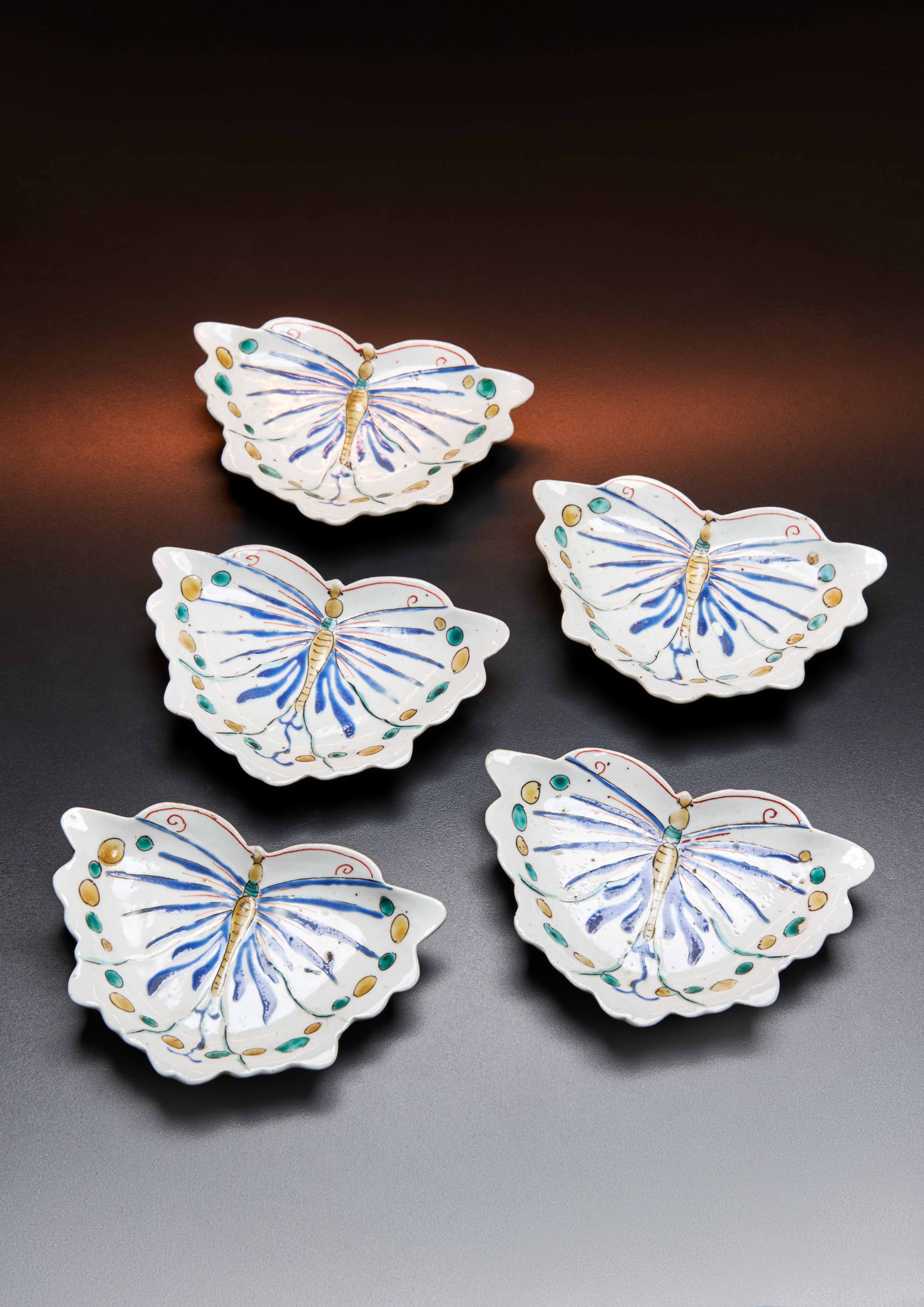 The small food dishes modelled as colourful butterflies, their open wings with details highlighted in yellow, green, blue and red enamels, their spiraling antennae painted in iron-red, all five raised on a short foot, all 12.7cm approx. (5)