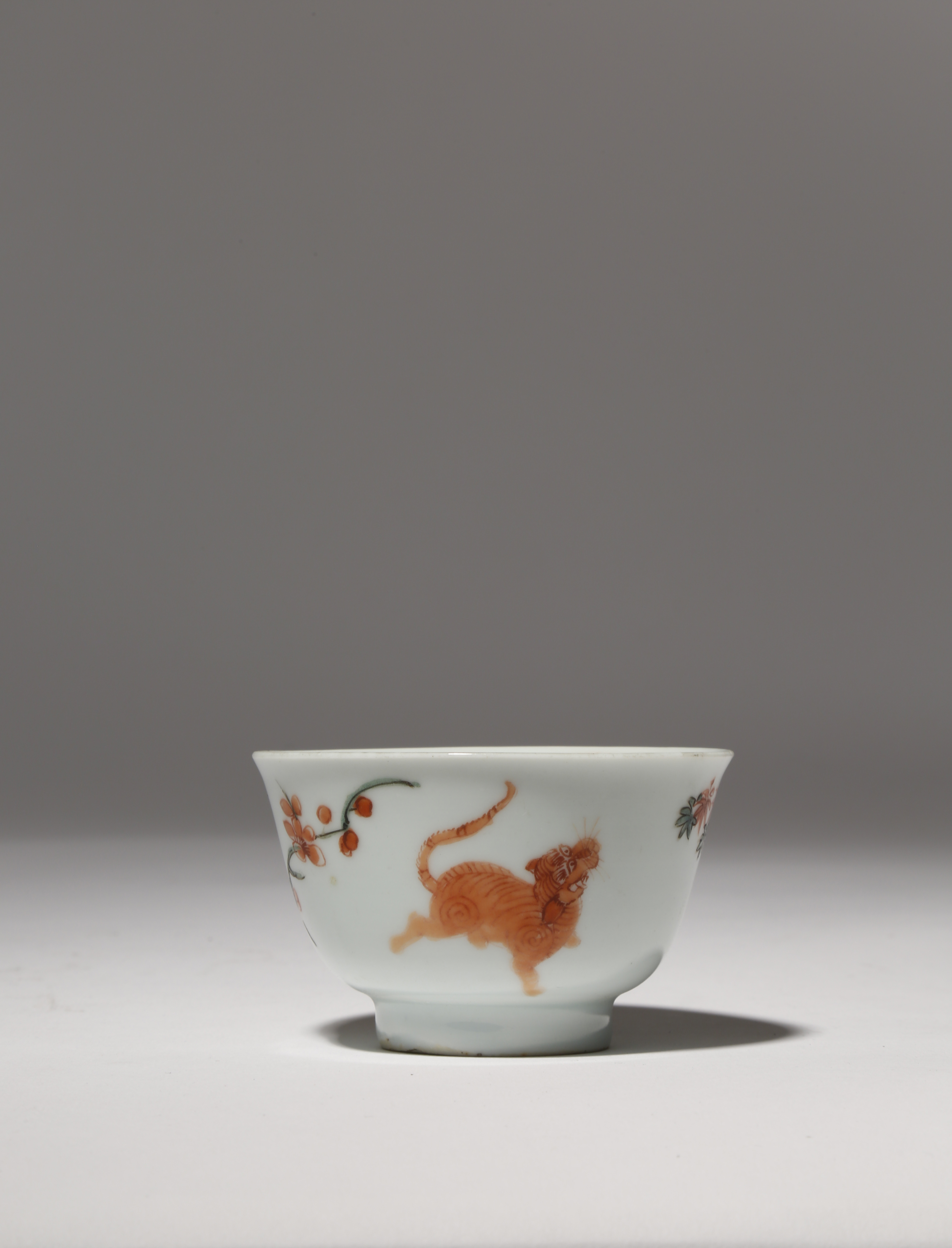 The body decorated in iron red, green and black enamels, the exterior painted with a small leaping tiger, with flowering prunus to the side and bamboo issuing from banded hedges, the interior with a band of chevrons underneath the rim and a central flowerhead to the well, 7.4cm.