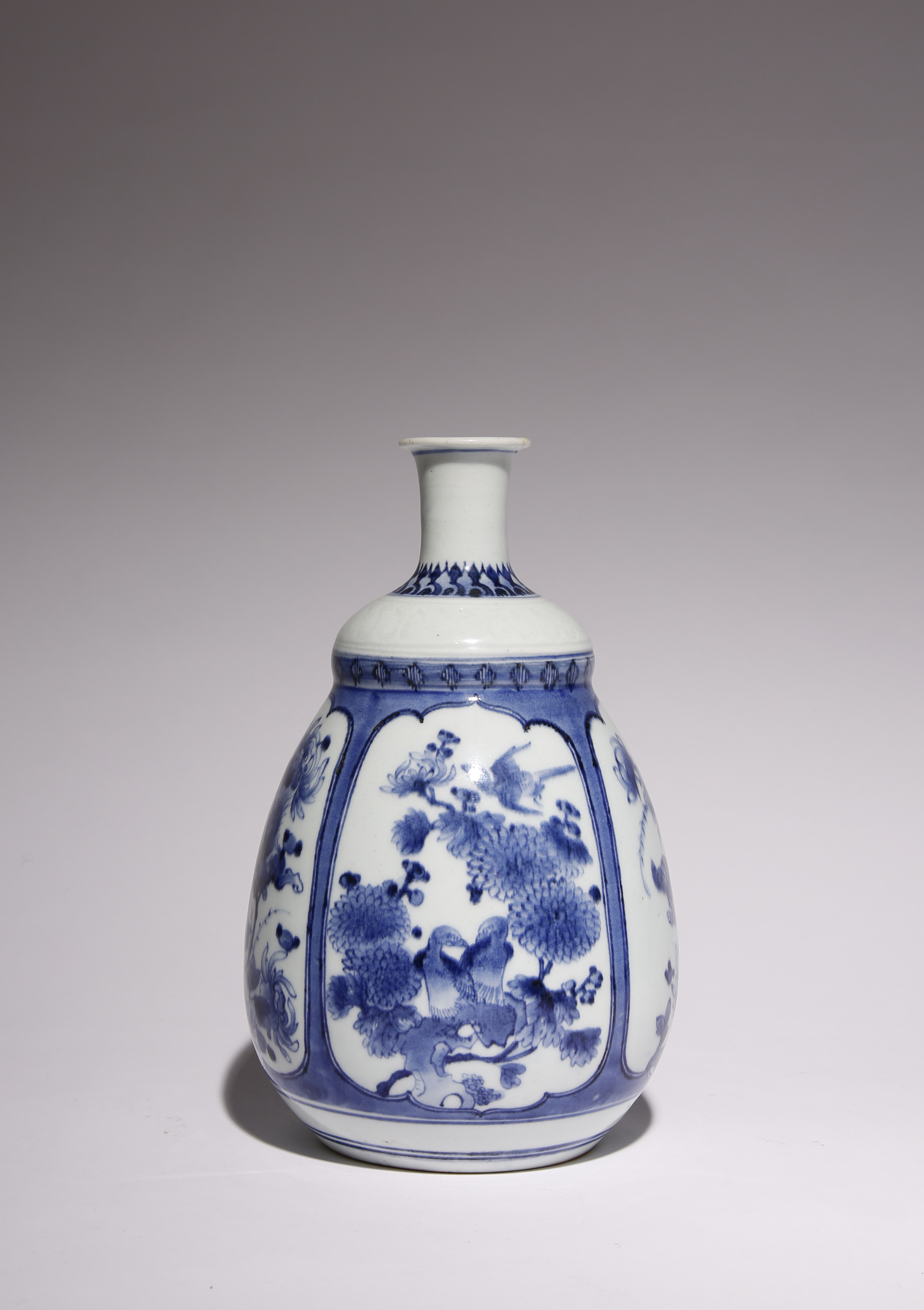 The pear-shaped sake bottle with a short neck and an impressed teardrop design to the shoulder, decorated in underglaze blue with alternating shaped panels of birds and flowers and shishi prancing amongst peonies, with bands of geometric designs above, 23.7cm.