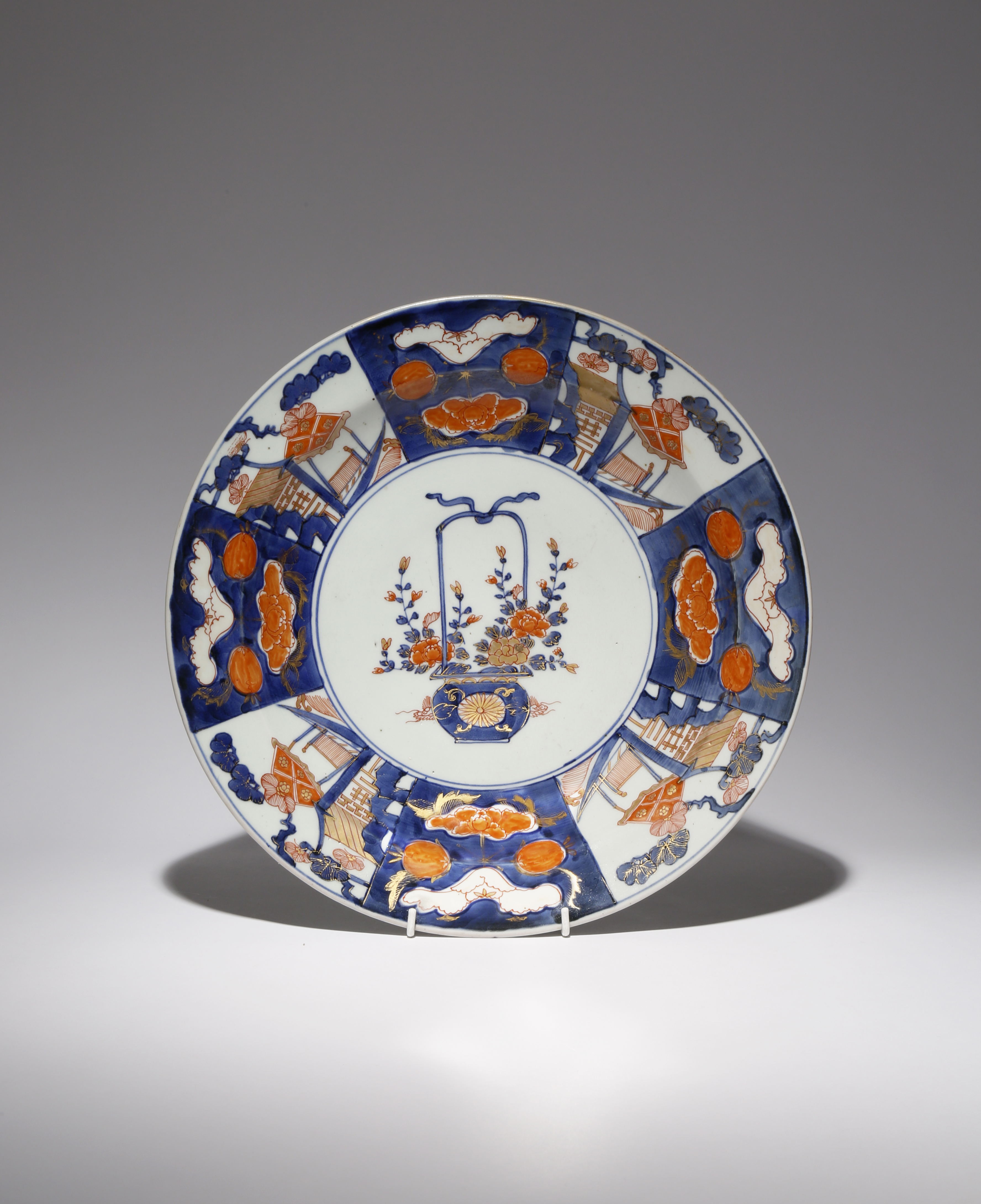 Typically decorated in underglaze blue, gilt and red enamels, painted to the well with a large hanging basket containing peonies and other foliage, the cavetto and rim with alternating panels of stylised flowerheads and a scene depicting a boat by a building and with branches of pine above, the underside painted with further branches following the rim, 37.7cm.