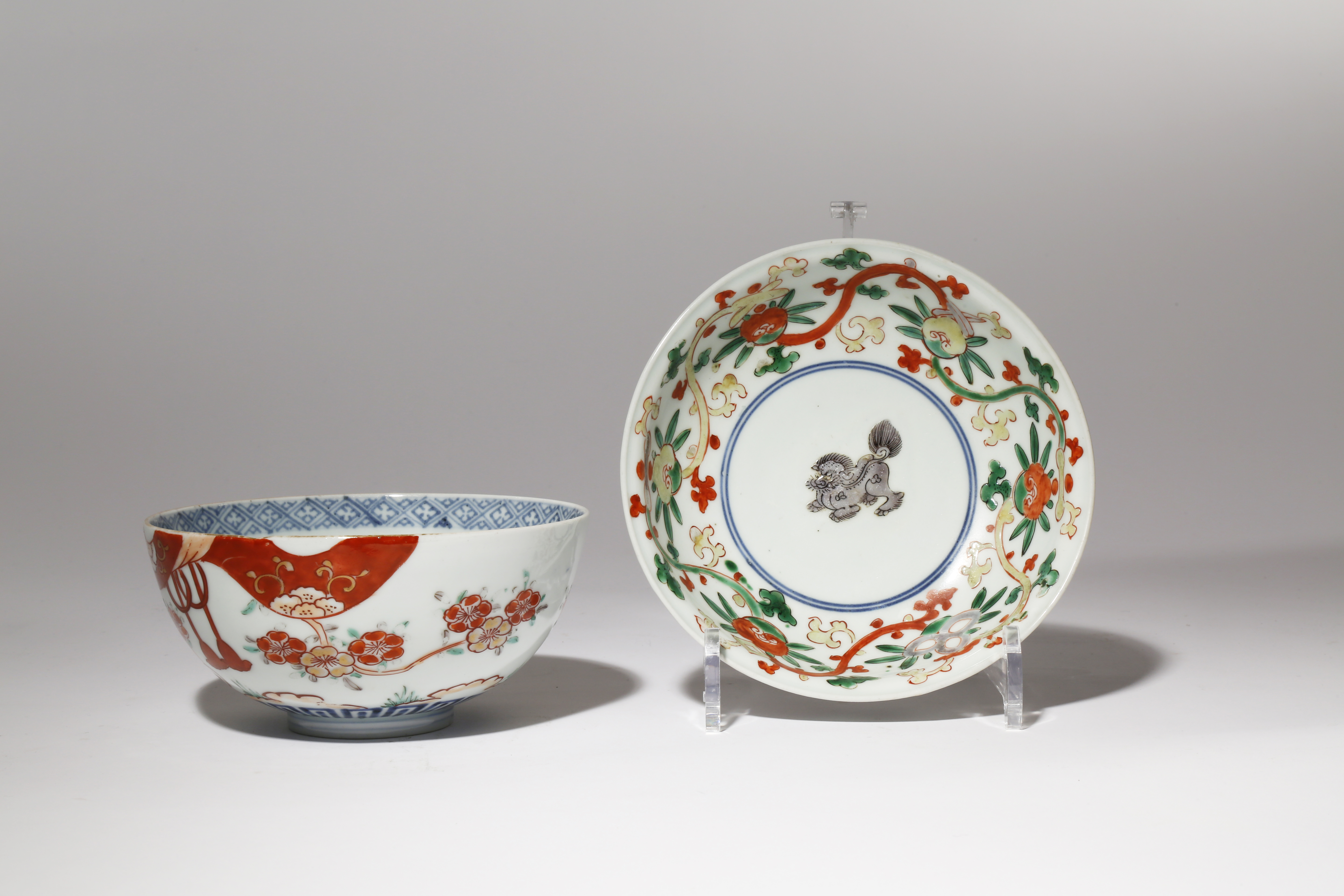 The first with a shallow body decorated in underglaze blue and polychrome enamels, painted to the interior with a shishi, scrolling tendrils and lotus flowers, the exterior with further flowerheads in medallions in the Chinese wucai style, the base with a mark reading Da Ming Chenghua nian zhi; the other bowl with branches of the Shochikubai, the Three Friends of Winter (bamboo, prunus, pine) to the well and the exterior with prunus flowers, curtains and tassels, 16.4cm and 14.9cm respectively. (2)