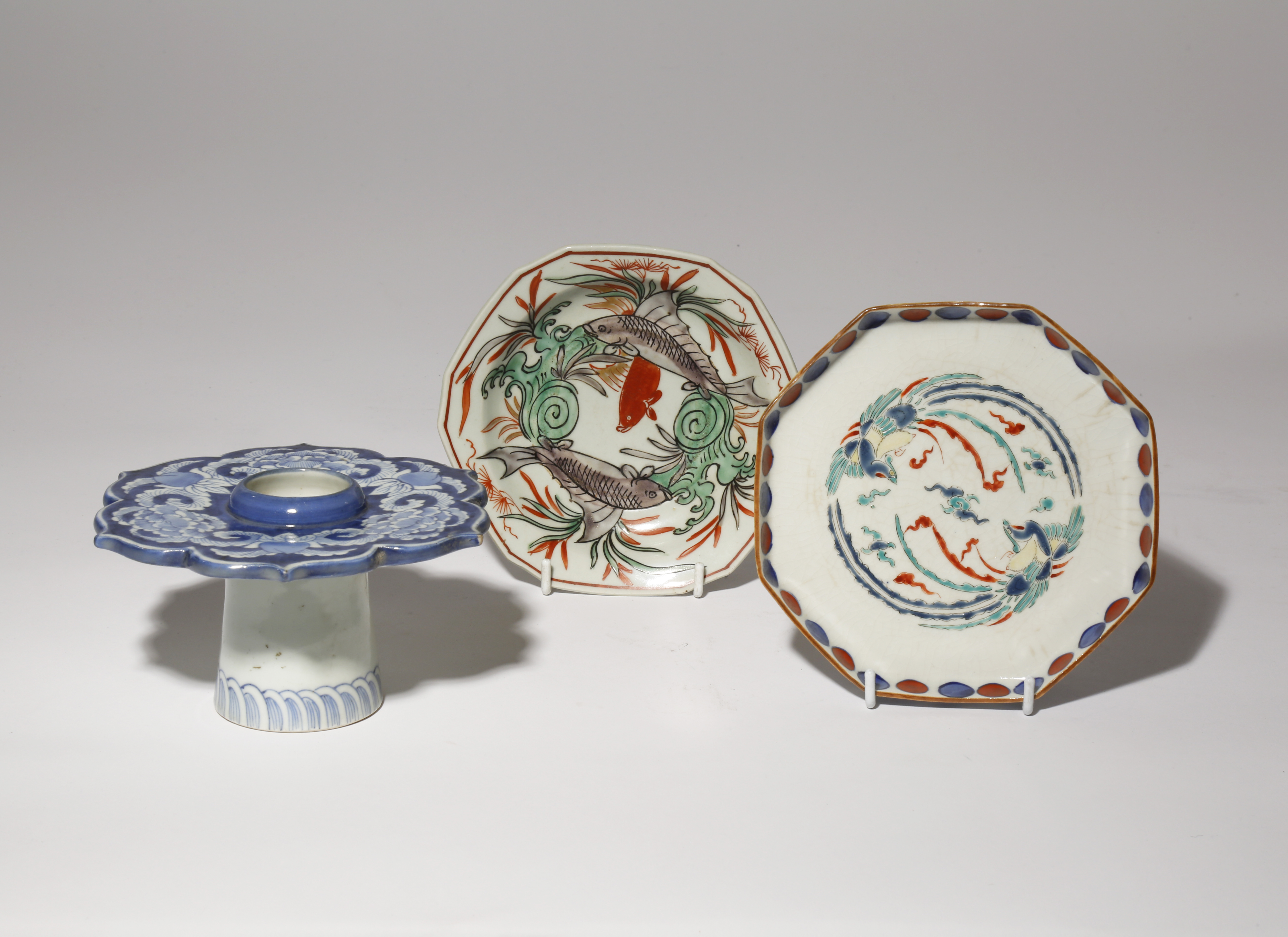 One shaped as a cup stand with a tall flared rim decorated with peaches and peonies, a paper exhibition label underneath for 'The Lost Century' Exhibition, 1998, loan number 121; another a Kakiemon-style octagonal dish with ho-o birds and blue and red roundels to the rim; with scrolling foliage underneath and a fuku mark to the base, a paper exhibition label for OCS 2006, The World in Colours, no.96; the third a hexagonal dish decorated with two fish amongst seaweed painted in gilt, purple, green and red enamels, a paper label for R&G McPherson Antiques, London W8, no.21155, 15cm max. (3)