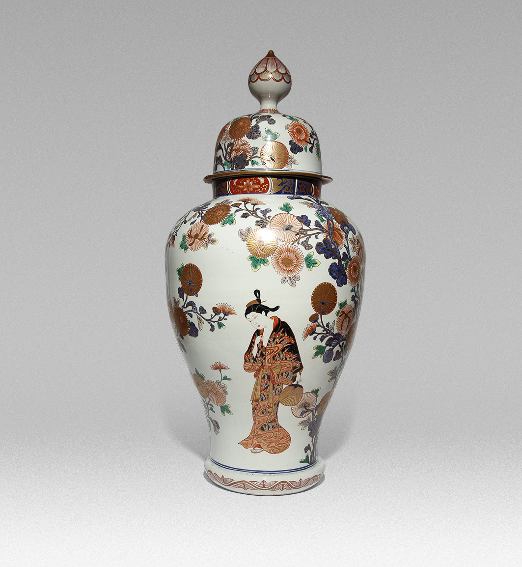 The baluster body typically decorated in underglaze blue, gilt, red, green and black enamels, painted with two bijin in a luxuriant garden, the beauties wearing black robes and surrounded by a multitude of large flowering chrysanthemums, the flange and the rim of the lid with a band of stylised flowerheads and scrolling tendrils in gilt, topped by a large bulbous knop, 88cm overall. (2)