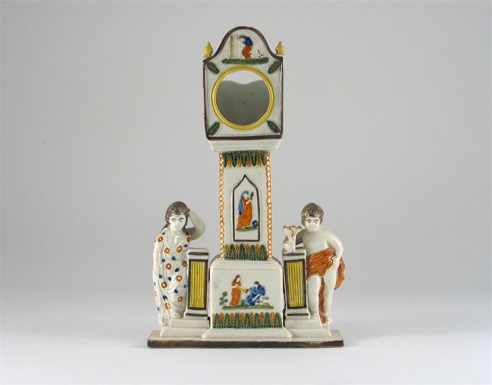 A rare Prattware watch stand, modelled as a long case clock, flanked by a boy and a girl and decorated in blue, green, yellow, ochre and brown. A few small repairs. Early 19th century, 26.5cm. Cf. J & G Lewis, Pratt Ware, the dust jacket for another example.