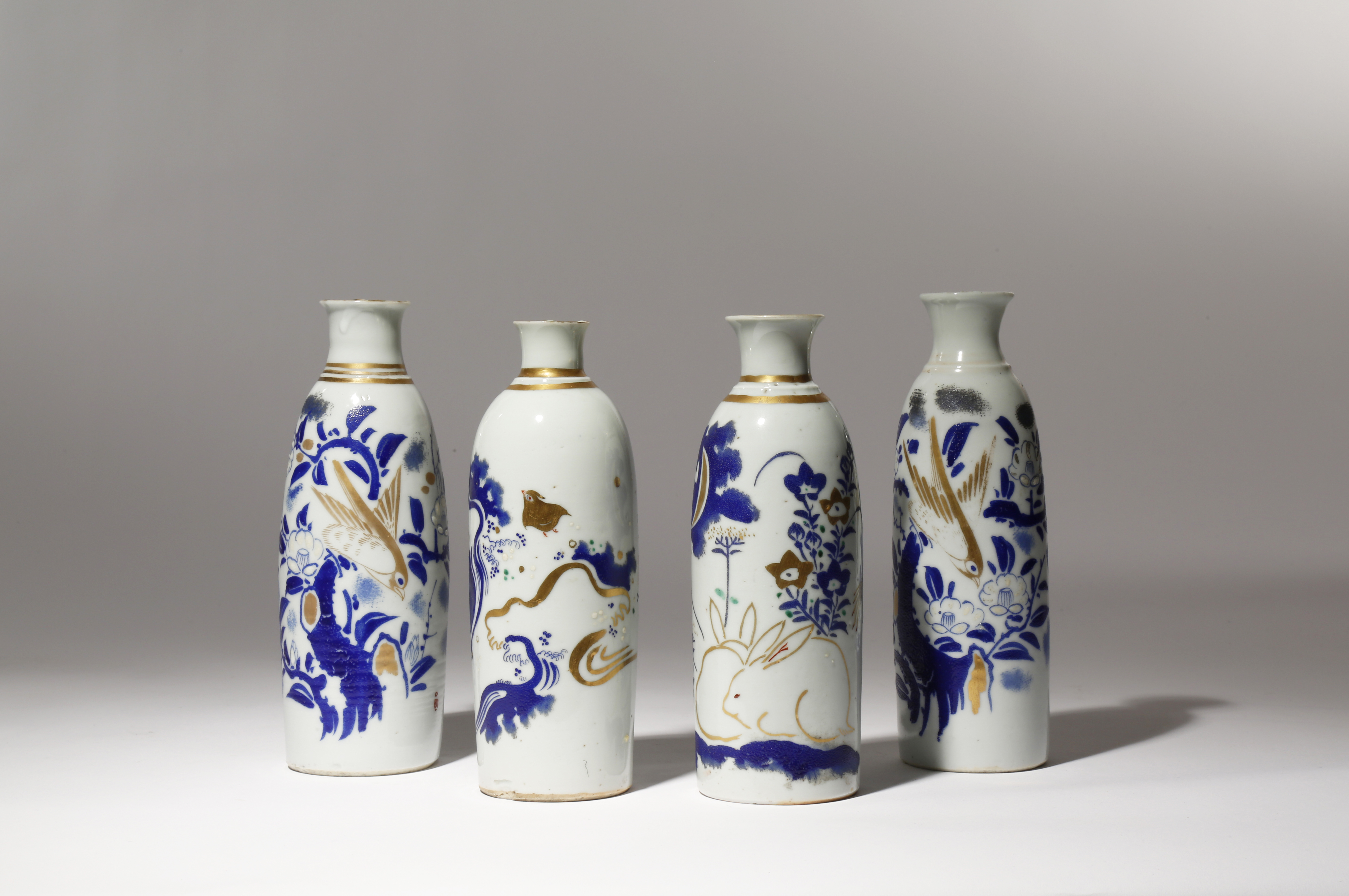 The sake bottles with tall bodies decorated in blue and gilt, variously painted with birds amongst flowers, chidori (plovers) in flight above waves and two rabbits underneath the crescent moon, three with paper collection labels underneath, 19cm max.(4)