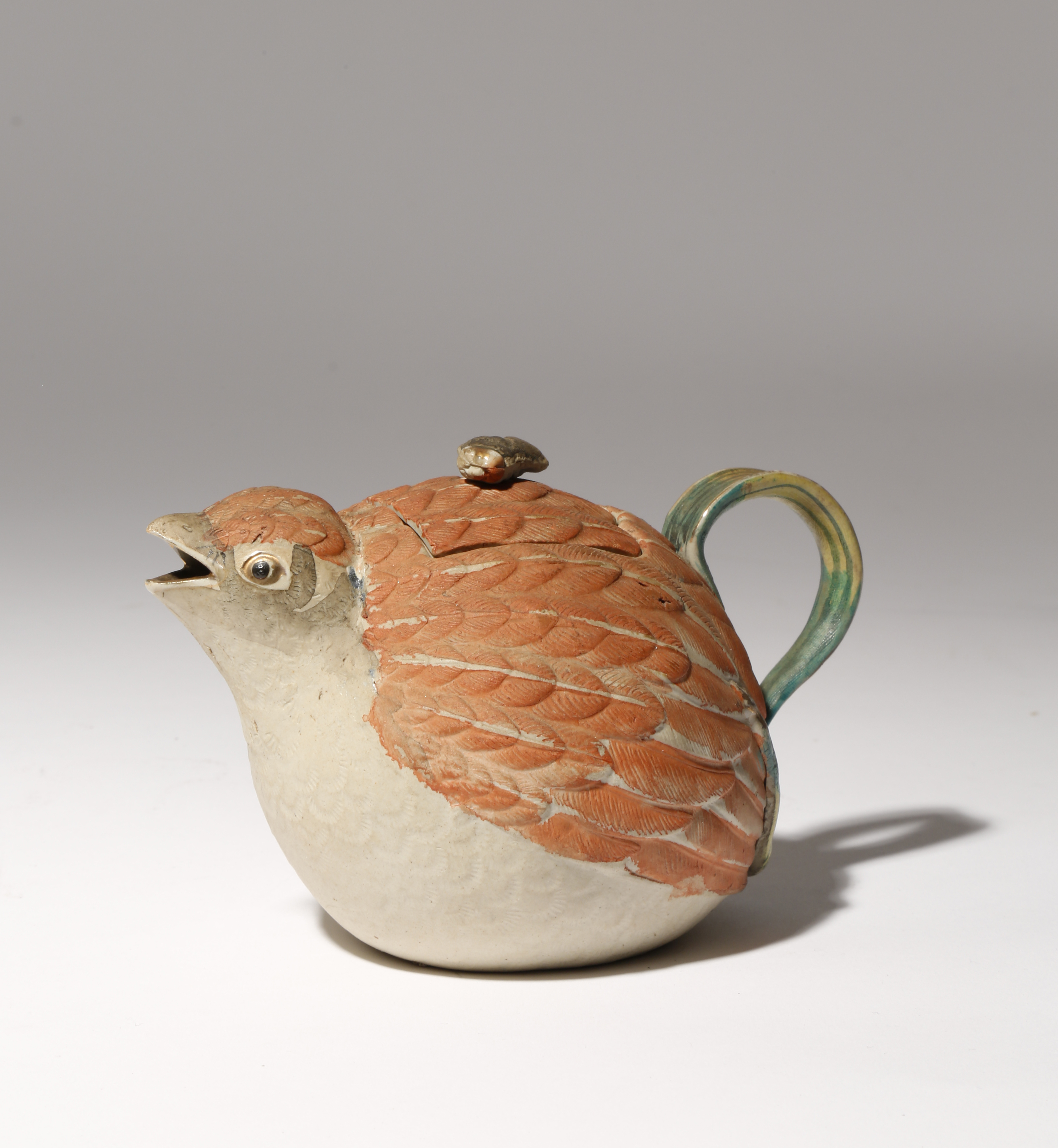 The body shaped as a small quail, the beak of the plump bird forming the spout and the long grasses against its back curving to create the handle; the lid with a small bee-shaped knop; with details highlighted in gilt, the base stamped Banko in a gourd-shaped reserve, 13.4cm. (2)