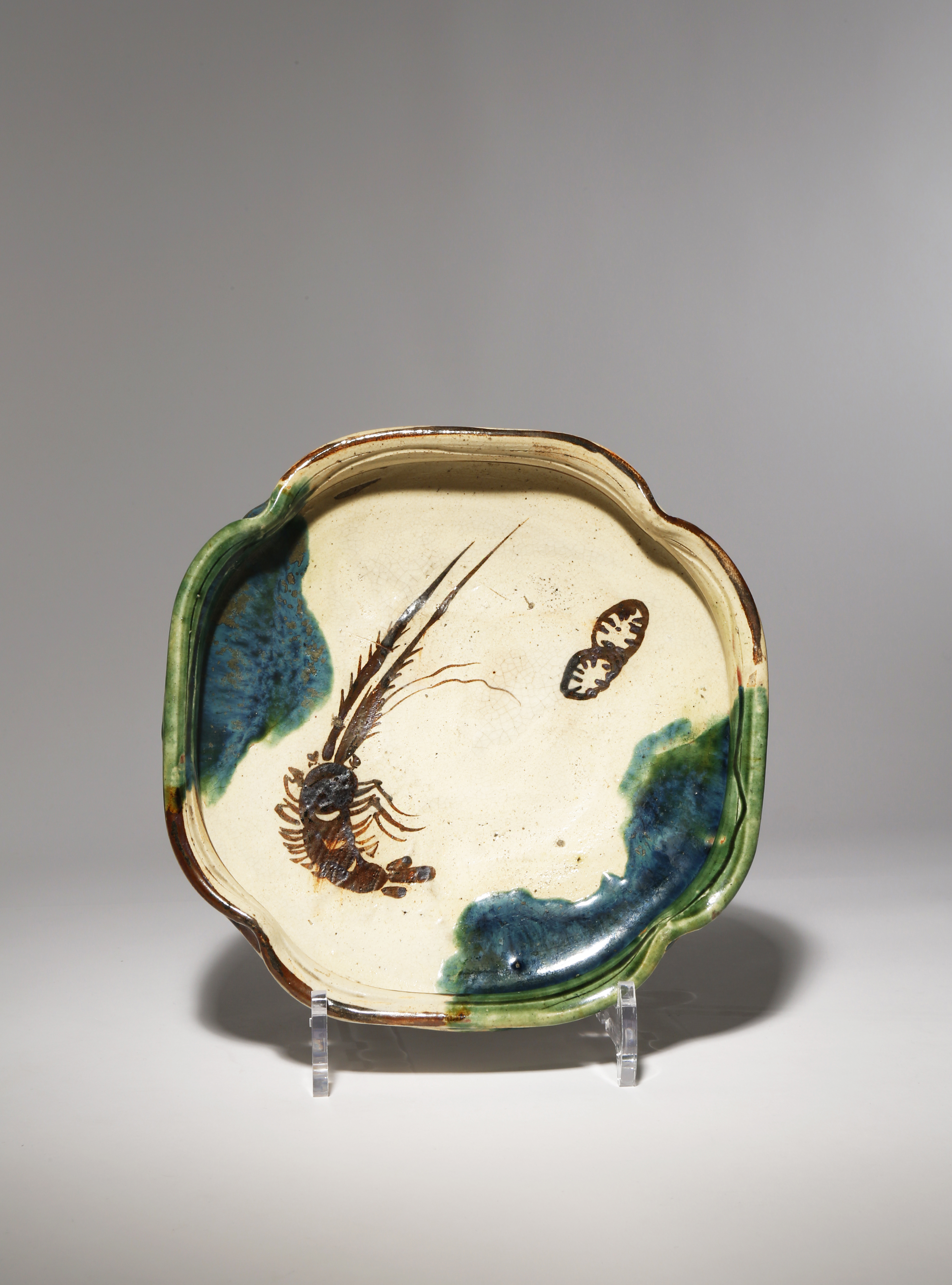The quatrelobed body decorated with splashes of thick blue and green enamels, the well with a large stylised crayfish and an amoeba-like organism, the short raised rim with brown abstract patterns and the underside left bare, 19.8cm.