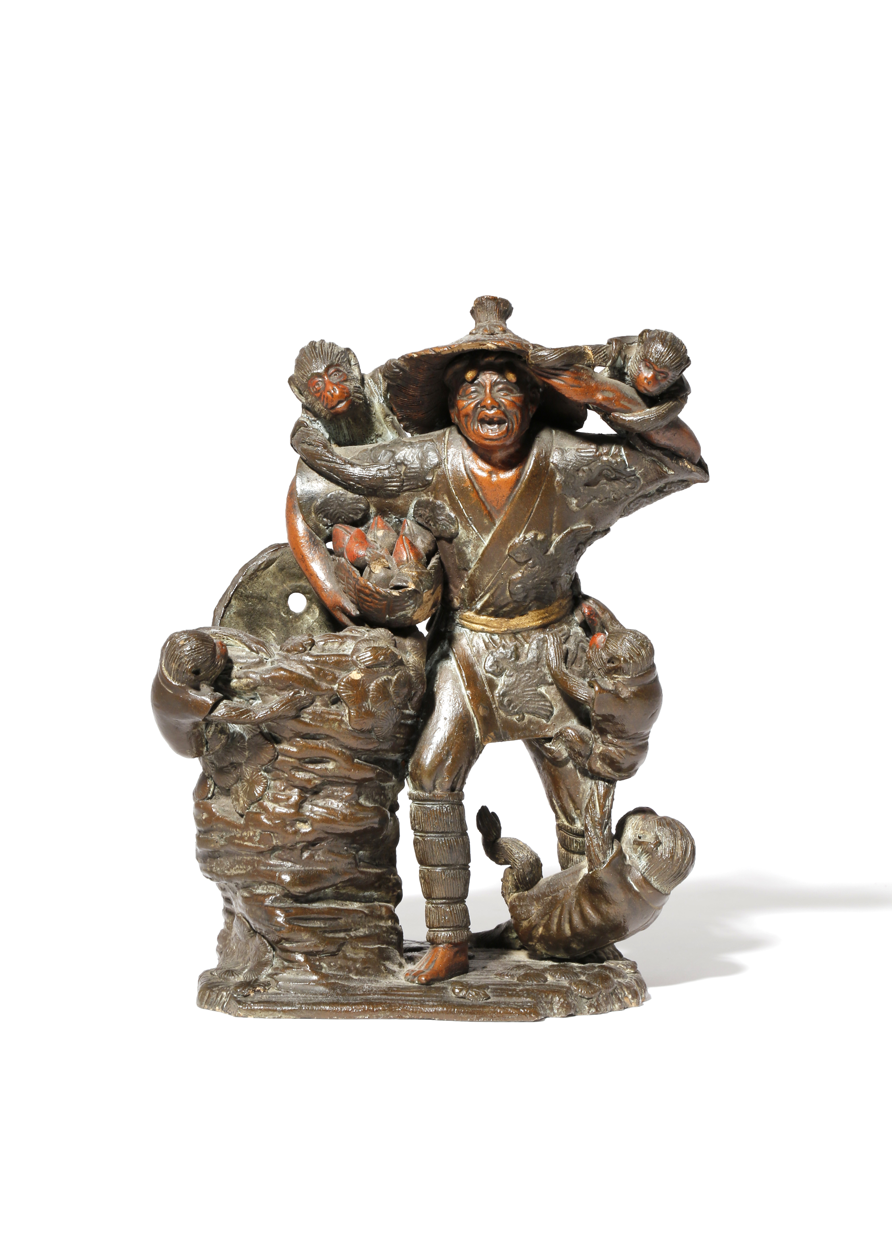 Modelled as a farmer being attacked by four monkeys, the primates attempting to steal his basket of peaches, the man holding on to his straw hat while crying out in surprise, with details picked out in red and gilt, the base with a paper label in French reading 'Taken by Alfred Eyben, born in Anvers 19.12.1834, from the Siege of Shanghai, sailor on board the French warship Jeanne d'Arc with Captain Gambard, 1856', 21cm.