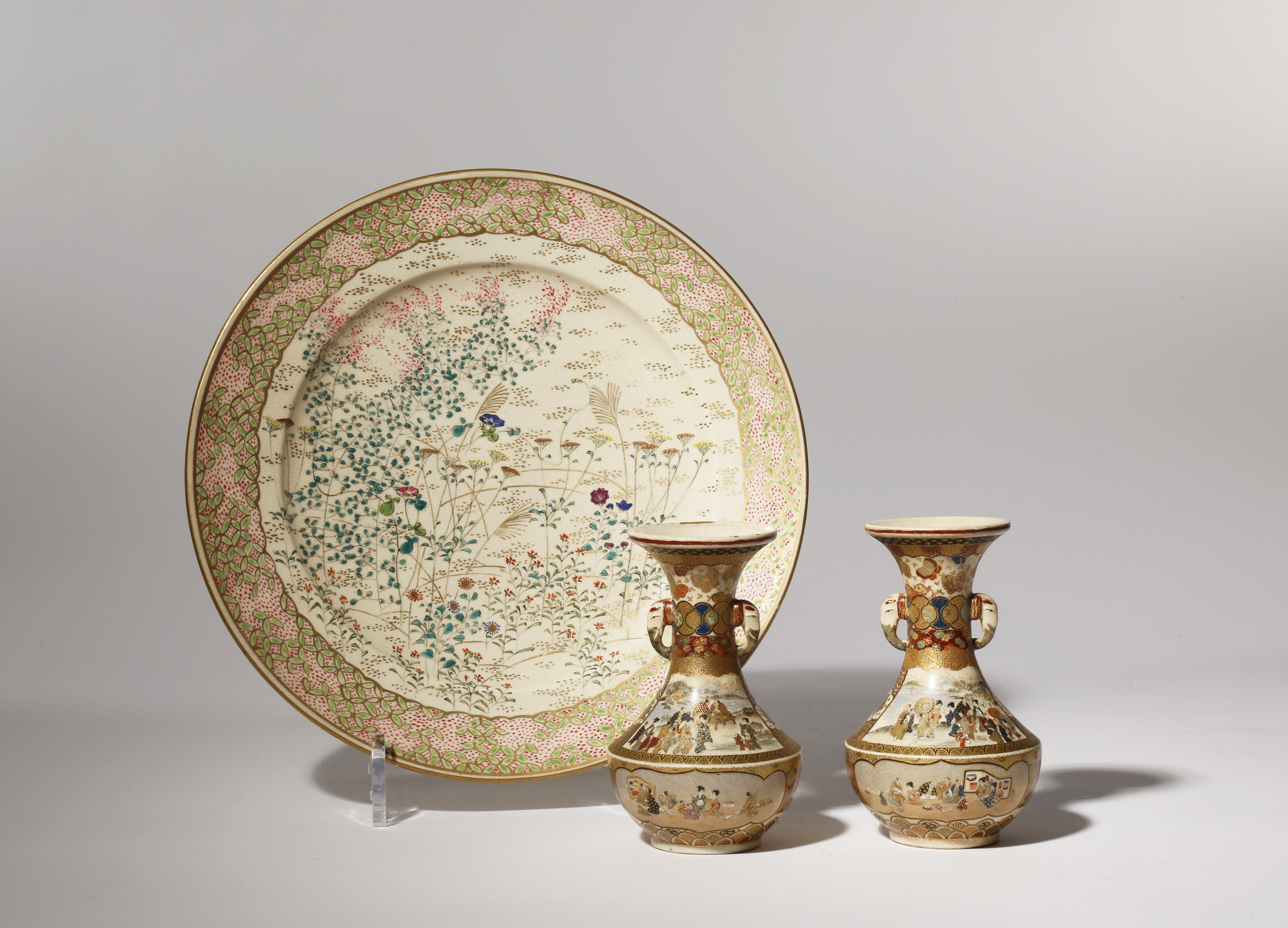 The pear-shaped vases with elephant head-shaped handles, both decorated with panels enclosing many figures on a ground of brocade designs and geometric patterns, both signed underneath; the plate painted with many flowers and foliage, the rim with a band of shippo-tsunagi cash designs, signed to the back Dai Nihon Taizan sei for Taizan Yohei (1864-1922), 11.8cm and 24.6cm respectively. (3)