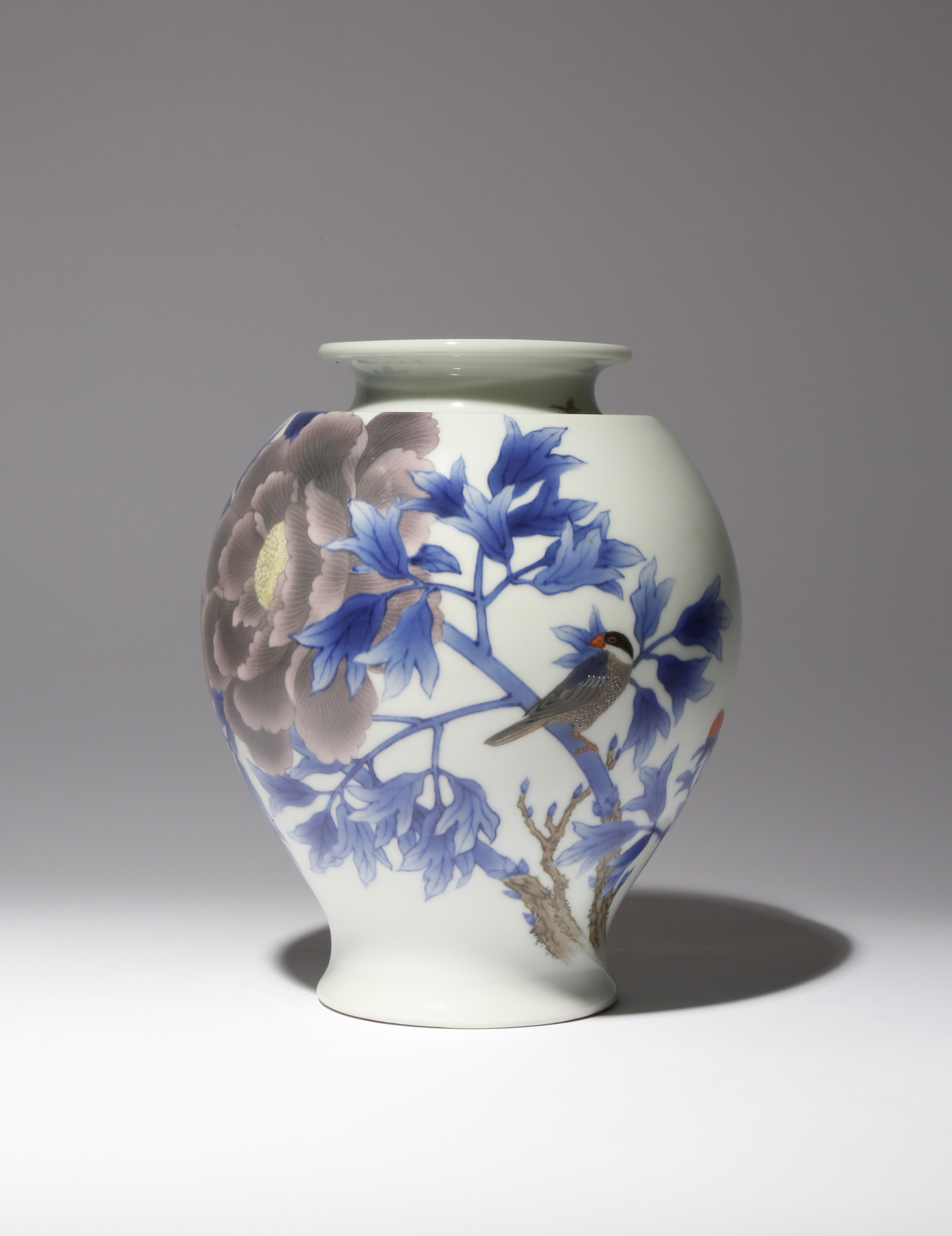 The bulbous body raised on a flared foot, decorated in underglaze blue and purple and overglaze red and yellow enamels, with two large peonies amongst foliage and two small birds, one flying towards the blooms and the other perched on a branch, a small butterfly above, the base signed Makuzu Kozan saku, 25.5cm.