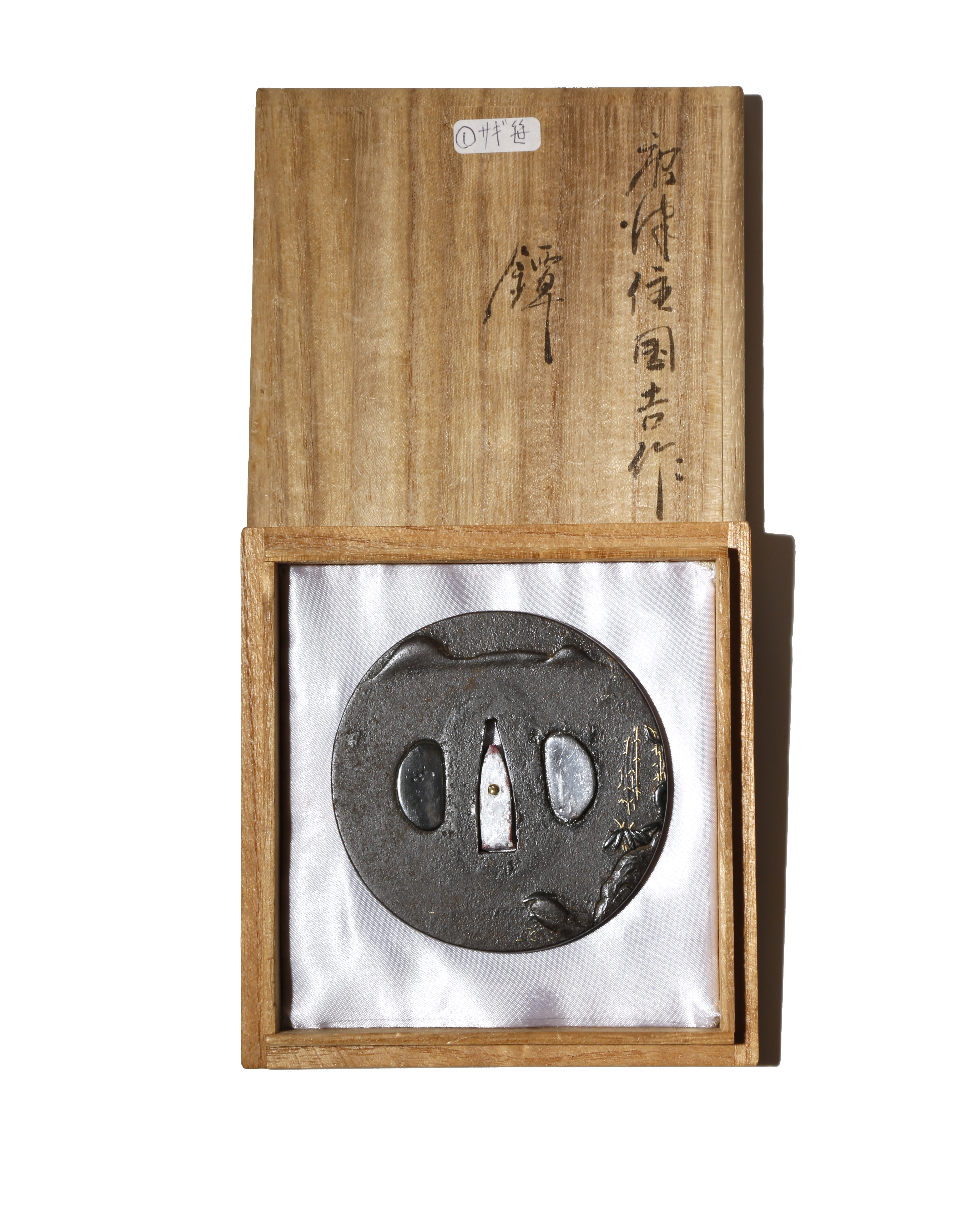 Of circular shape, one side decorated with the lone figure of a traveller with a long coat and a wide-brimmed hat, by rocky outcrops and underneath branches of weeping willow; the reverse with small pines visible in the distance, unsigned, with Hozon Tosogu (Sword fitting Worthy of Preservation) certificate no.4014656 issued by the Nihon Bijutsu Token Hozon Kyokai (The Society for the Preservation of the Japan Art Sword), dated 22nd February 2019, in a kiri box, 7.5cm. (3)