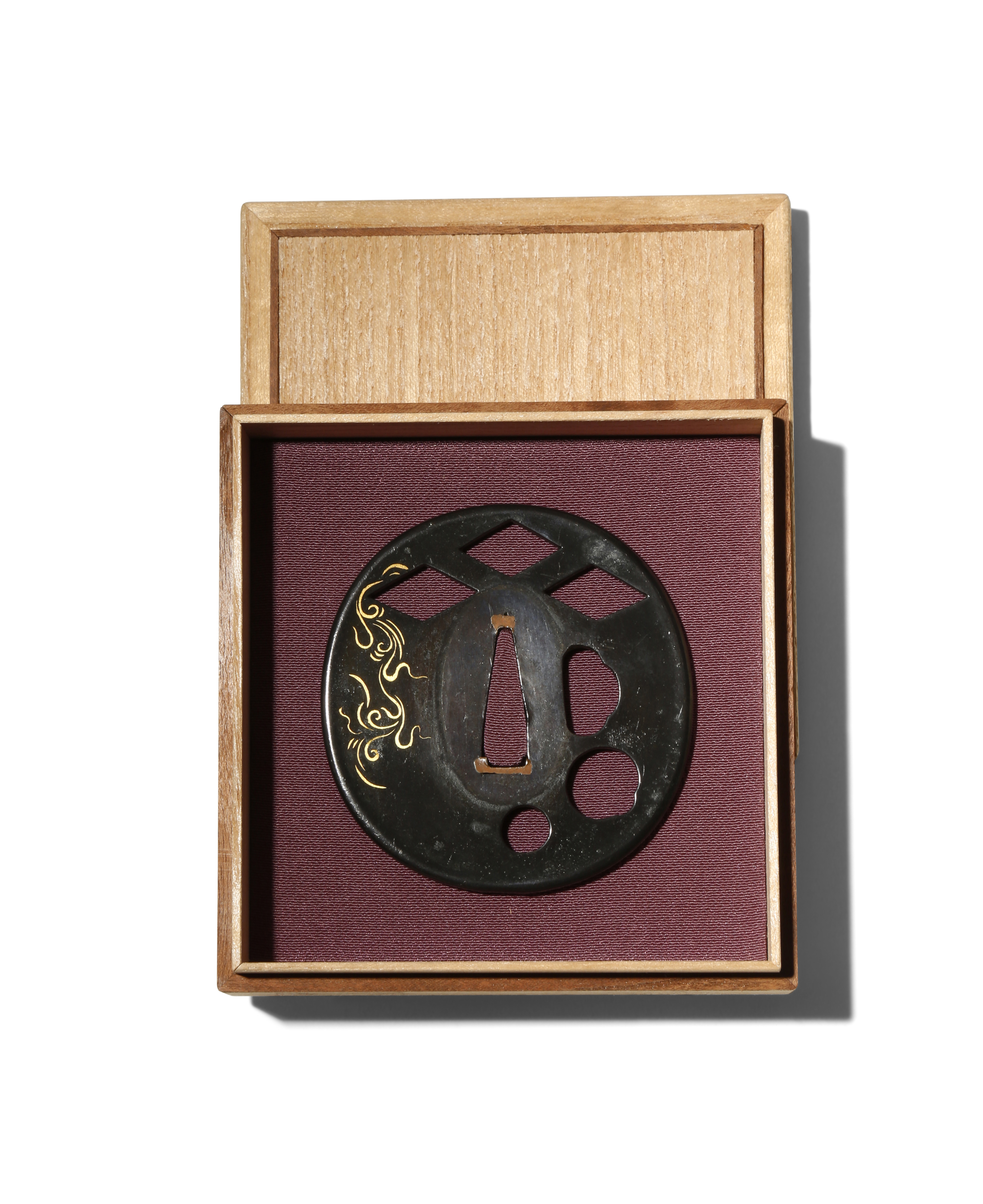 Of circular form, decorated in openwork with rhomboid and circular apertures, with arabesques in gold inlay, unsigned, with Hozon Tosogu (Sword fitting Worthy of Preservation) certificate no.4005012 issued by the Nihon Bijutsu Token Hozon Kyokai (The Society for the Preservation of the Japan Art Sword), dated 2nd May 2014, in a kiri box, 7cm. (3)