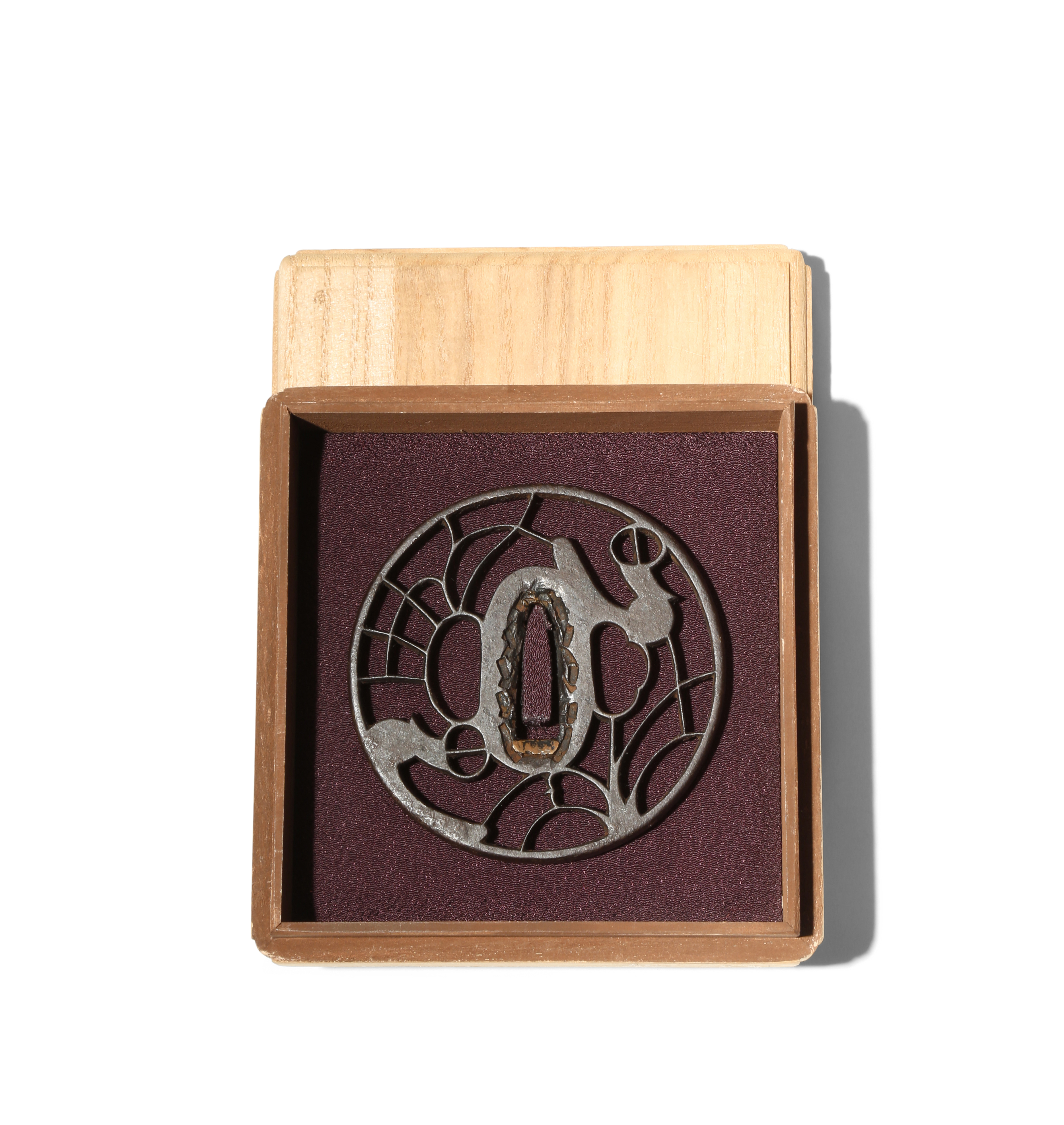 The circular body decorated in openwork with a design of abumi stirrups, unsigned, with Hozon Tosogu (Sword fitting Worthy of Preservation) certificate no.4000627 issued by the Nihon Bijutsu Token Hozon Kyokai (The Society for the Preservation of the Japan Art Sword), dated 28th June 2012, in a kiri box, 7.6cm. (3)