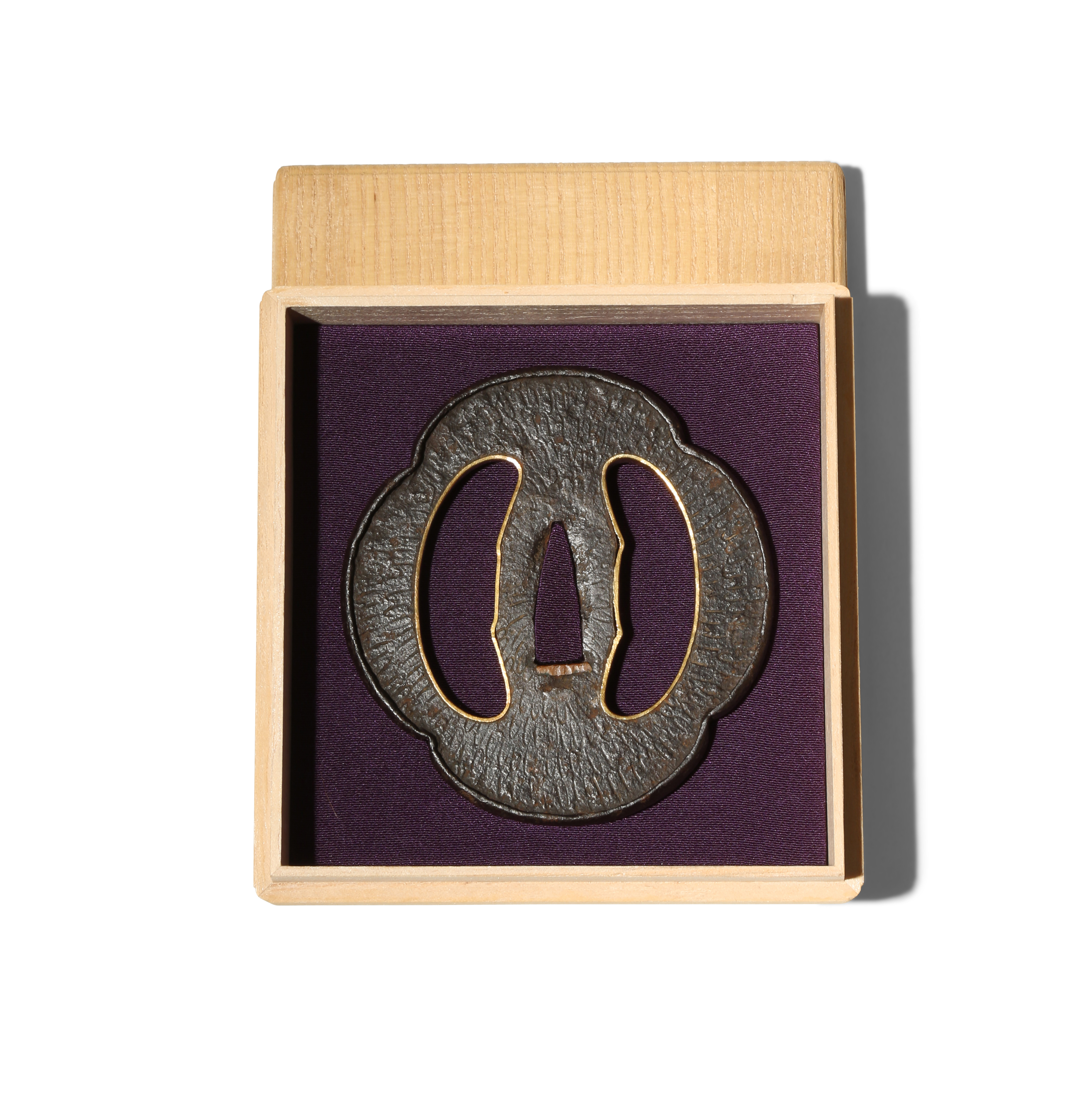 Of quatrelobed form, the openings shaped as sea cucumbers with gold rings applied to the rims, the surface with radiating marks, unsigned, with Hozon Tosogu (Sword fitting Worthy of Preservation) certificate no.4010539 issued by the Nihon Bijutsu Token Hozon Kyokai (The Society for the Preservation of the Japan Art Sword), dated 8th November 2016, in a kiri box, 9cm. (3)