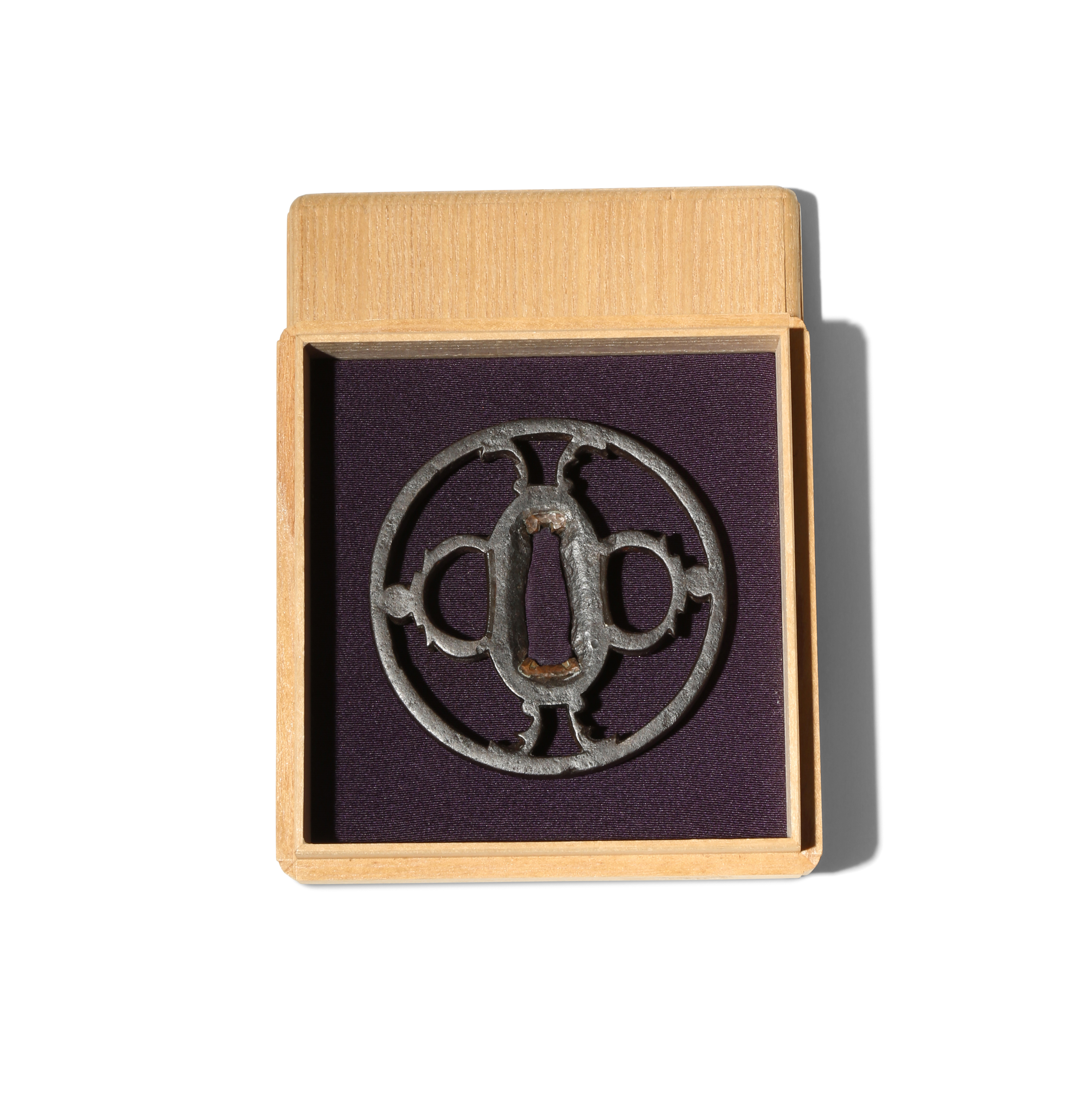 The circular plate decorated with a large openwork design (sukashi) of abstract symbols reminiscent of Buddhist jewels and ginger leaves, unsigned, with Hozon Tosogu (Sword fitting Worthy of Preservation) certificate no.453022 issued by the Nihon Bijutsu Token Hozon Kyokai (The Society for the Preservation of the Japan Art Sword), dated 18th October 2007, in a kiri box, 7cm. (3)