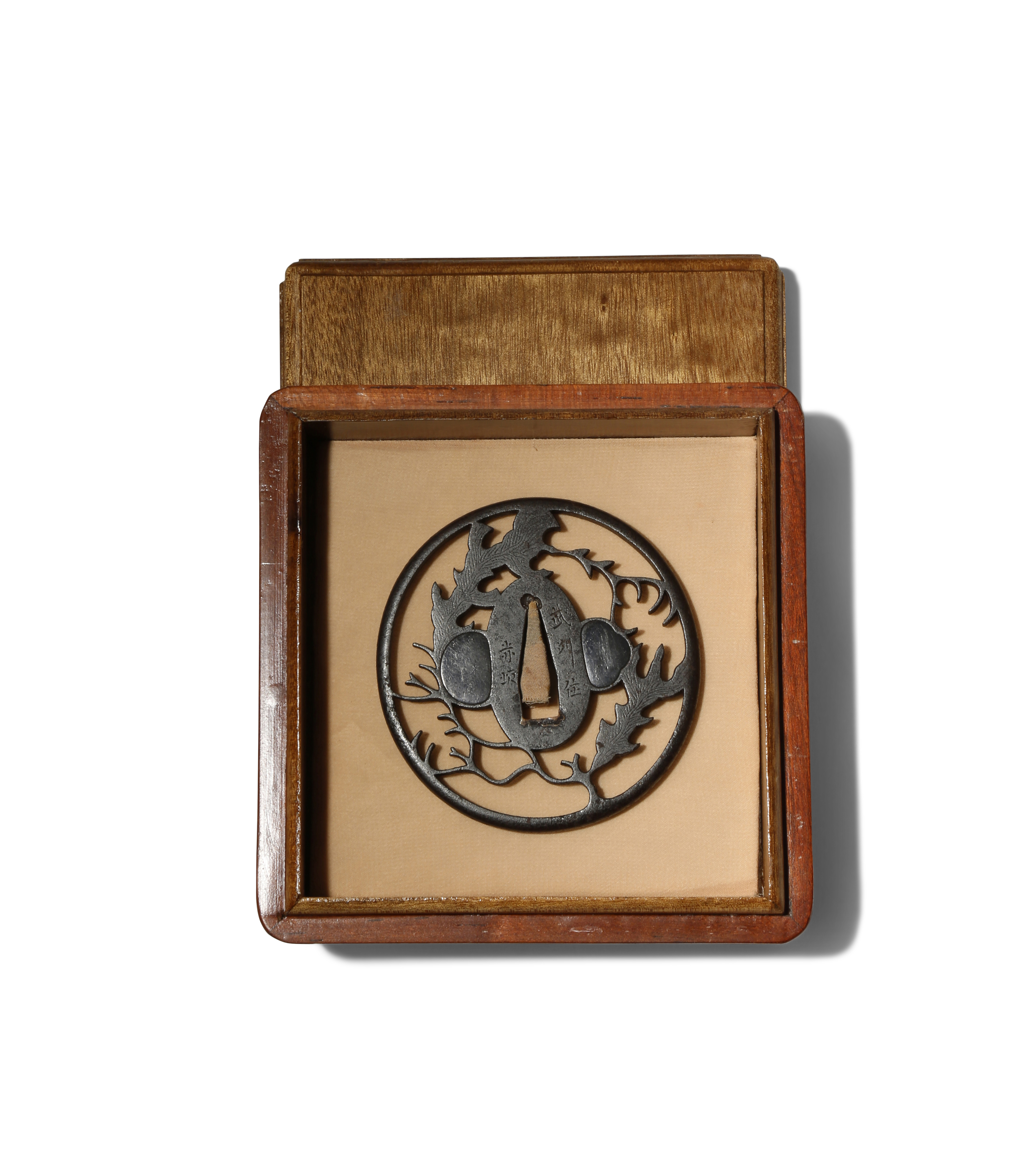 Of circular shape, decorated in openwork with a design of chrysanthemum leaves and stalks, the openings for scabbard accessories plugged with shakudo, inscribed Bushu-ju Akasaka, Tadatori saku, with Hozon Tosogu (Sword fitting Worthy of Preservation) certificate no.457856 issued by the Nihon Bijutsu Token Hozon Kyokai (The Society for the Preservation of the Japan Art Sword), dated 30th April 2009, in a kiri box, 7.6cm. (3)