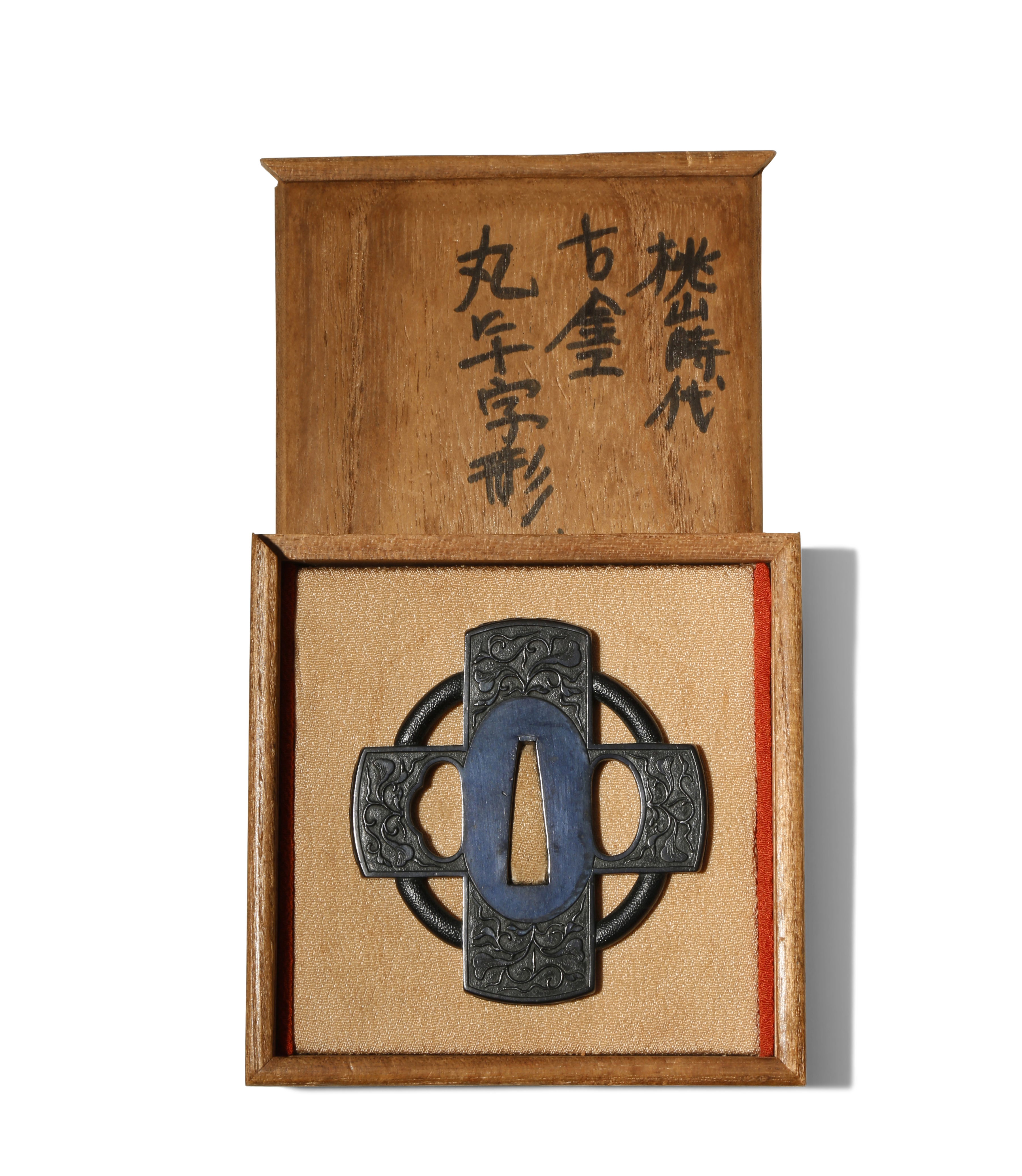 Shaped as a large cross with a ring linking its arms, the black surface decorated with designs of scrolling leafy tendrils, unsigned, with Hozon Tosogu (Sword fitting Worthy of Preservation) certificate no.4014660 issued by the Nihon Bijutsu Token Hozon Kyokai (The Society for the Preservation of the Japan Art Sword), dated 22nd February 2019, in a kiri box, 7cm. (3)