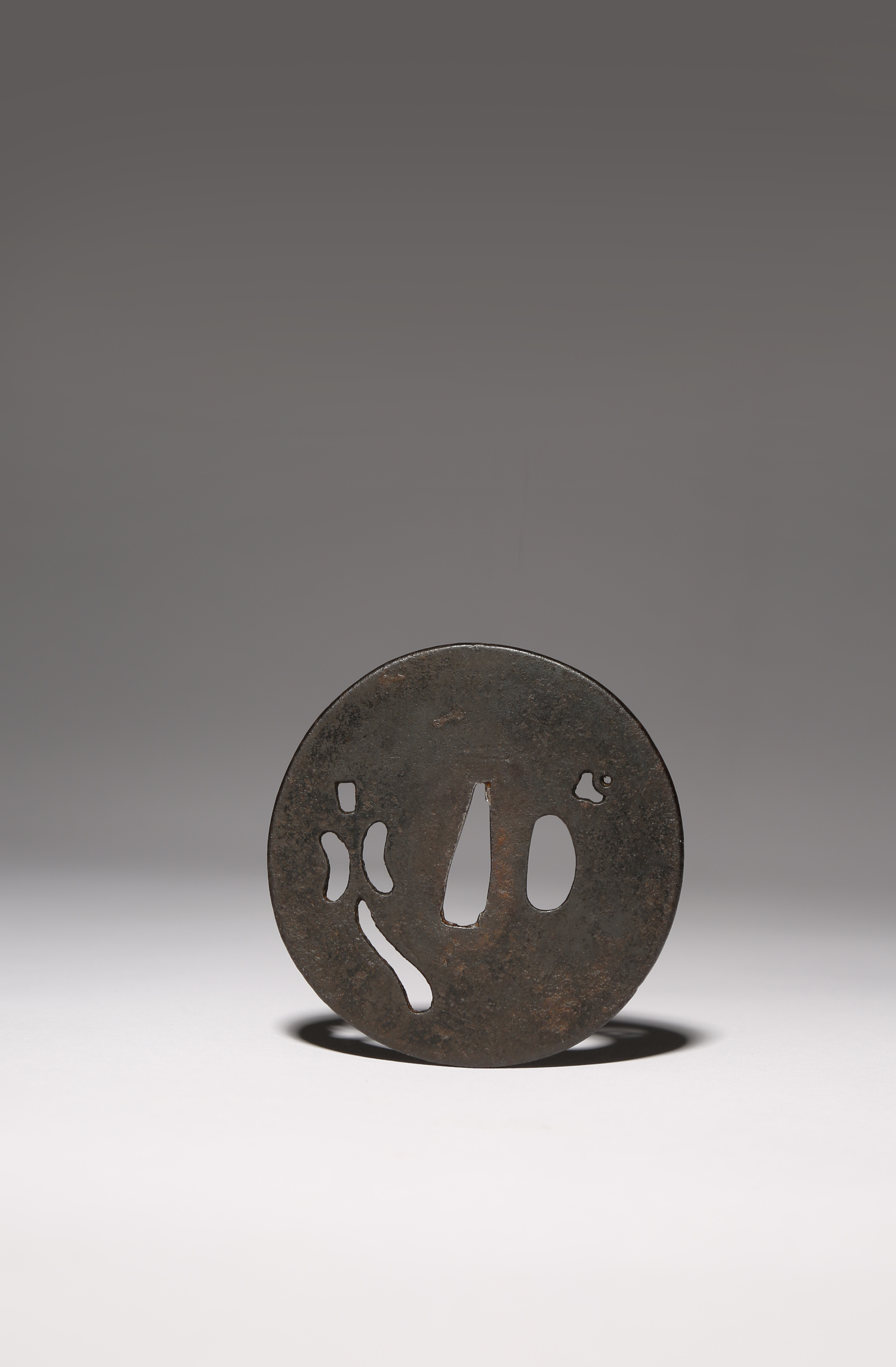 The circular plate bearing a dark brown patina, decorated with a war fan (gunbai) and a lucky charm in openwork (sukashi), unsigned, with Hozon Tosogu (Sword fitting Worthy of Preservation) certificate no.4014654 issued by the Nihon Bijutsu Token Hozon Kyokai (The Society for the Preservation of the Japan Art Sword), dated 22nd February 2019, in a kiri box, 8.2cm. (3)
