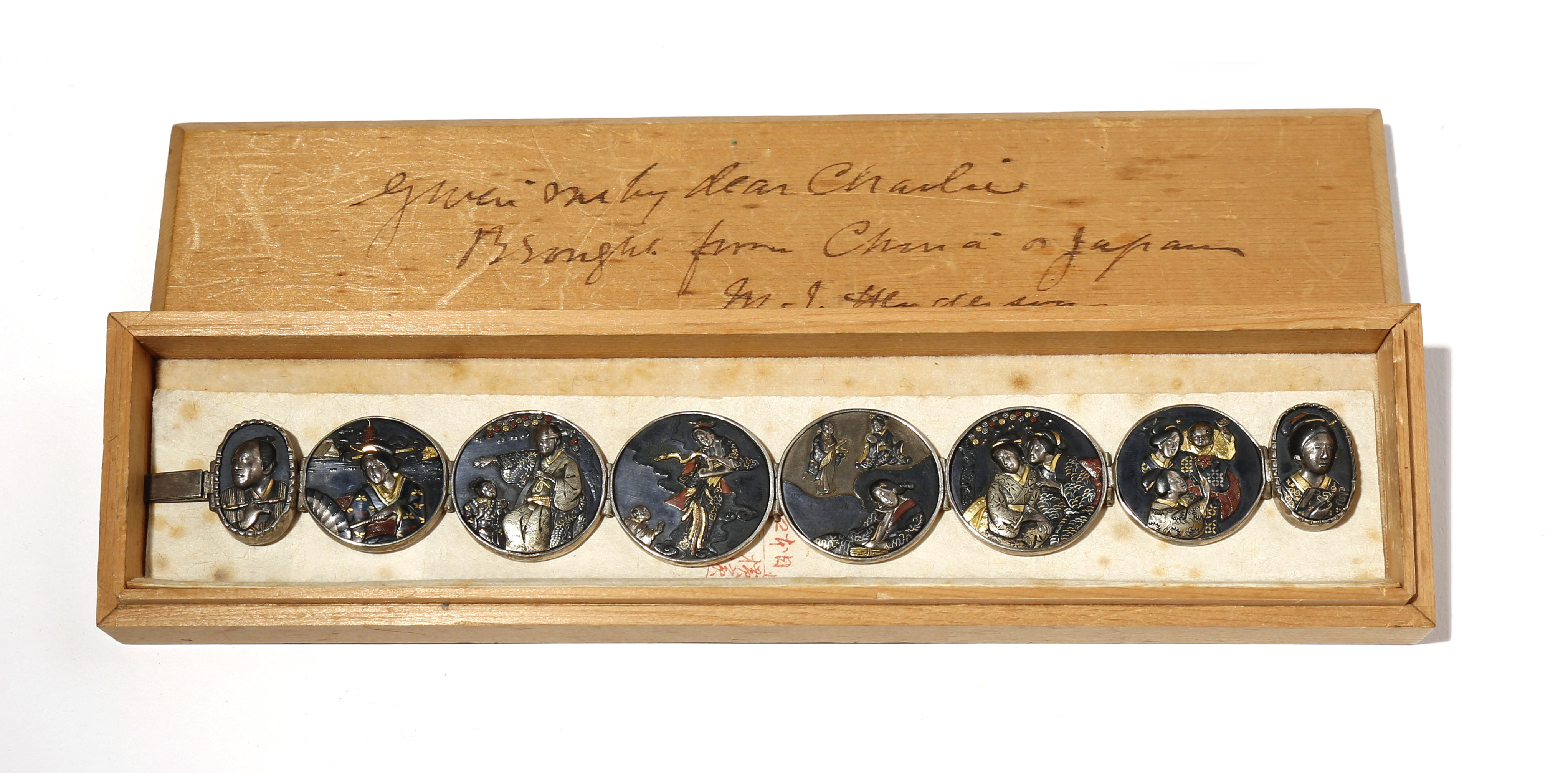 Composed of six circular discs and two oval ones set in rub-over silver mounts, the delicate scenes depicted in silver, gold and copper on the black shakudo ground; the first and last medallions with portraits of a man and a woman, the six other discs variously depicting: a beauty holding an umbrella before a three-storey pagoda; a man playing blind man's bluff with a child under sakura; a boy and a deity surrounded by clouds; a beauty fast asleep, a bubble above her showing her and her lover; two women conversing under prunus flowers, and a mother carrying a boy on her back whilst a small girl shows him a pinwheel; a small punch mark to the back of the clasp, together with the original box containing a paper lining stamped with a red shop mark with crane and calligraphy, the lid inscribed in ink 'Brought from China or Japan M.J.Henderson', 20.7cm. (3)