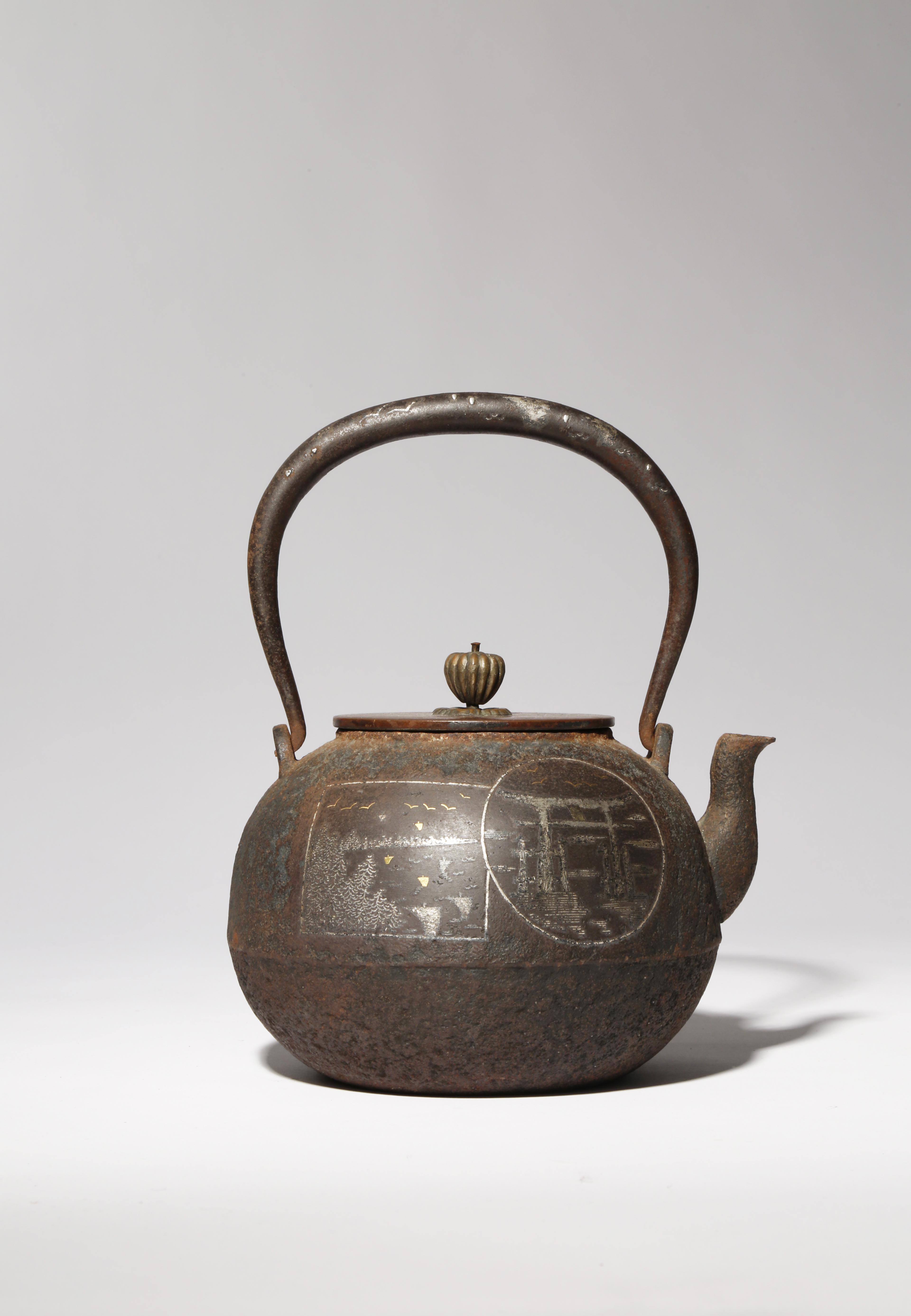 The kettle with a bulbous body decorated in gold and silver inlays and with a curved spout, one side decorated with a circular panel enclosing a depiction of the torii gate at Itsukushima Shrine, a square panel next to it with many trees and fishing boats; the reverse with birds flying over a mountainous river landscape, the handle with further birds and sailboats; the lid with a bud-shaped knop and signed Ryubundo zo, 21.5cm, (2)