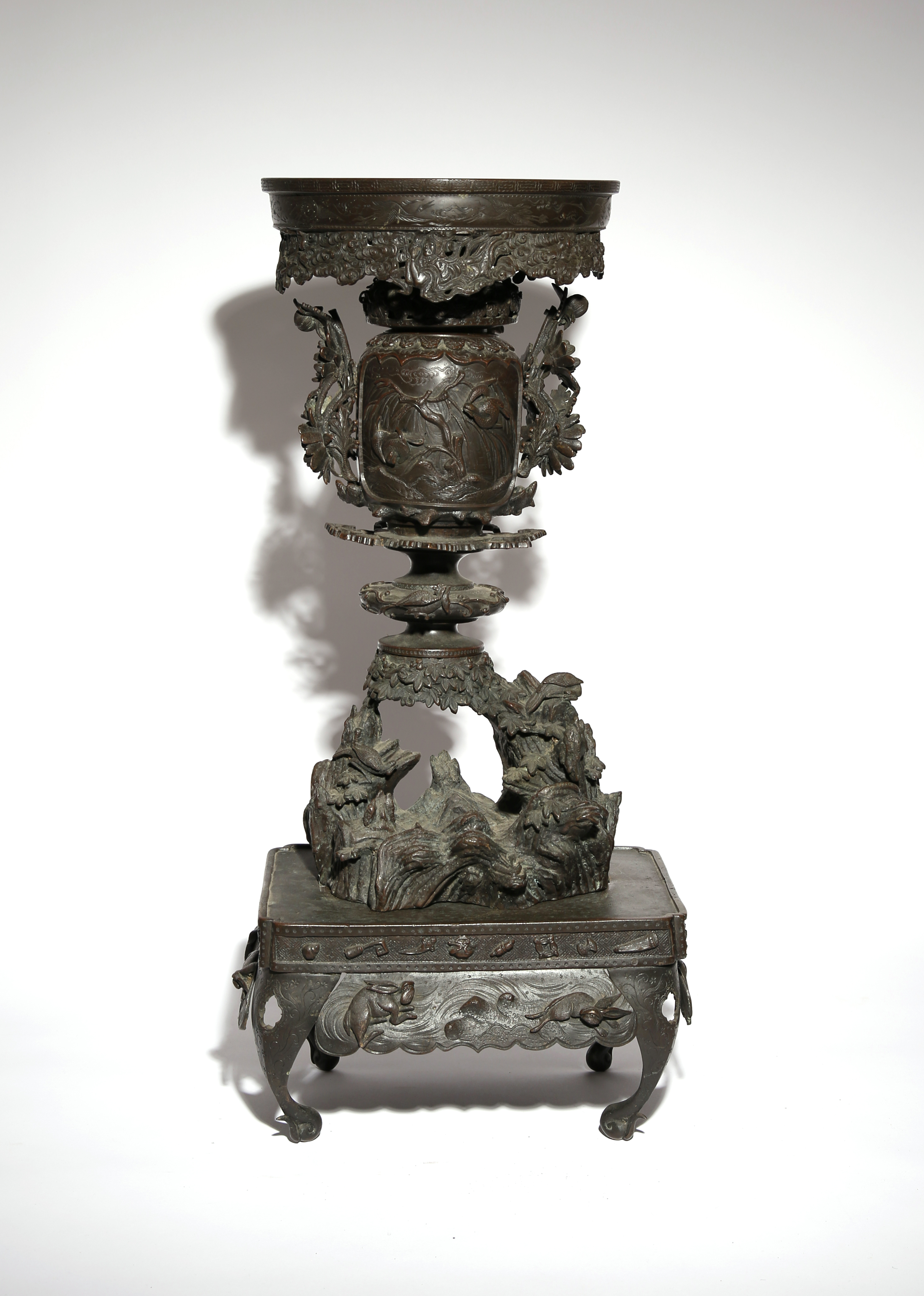 Raised on a four-legged rectangular stand decorated with hares running amongst waves and bands of Buddhist symbols, with birds perched on leafy trunks above supporting the main urn; the body of the vessel decorated with two panels enclosing further birds amongst foliage, the handles cast as large flowerheads; the top with a large flattened rim, the apron decorated with tennin flying amongst scrolling clouds, 77cm overall. (4)