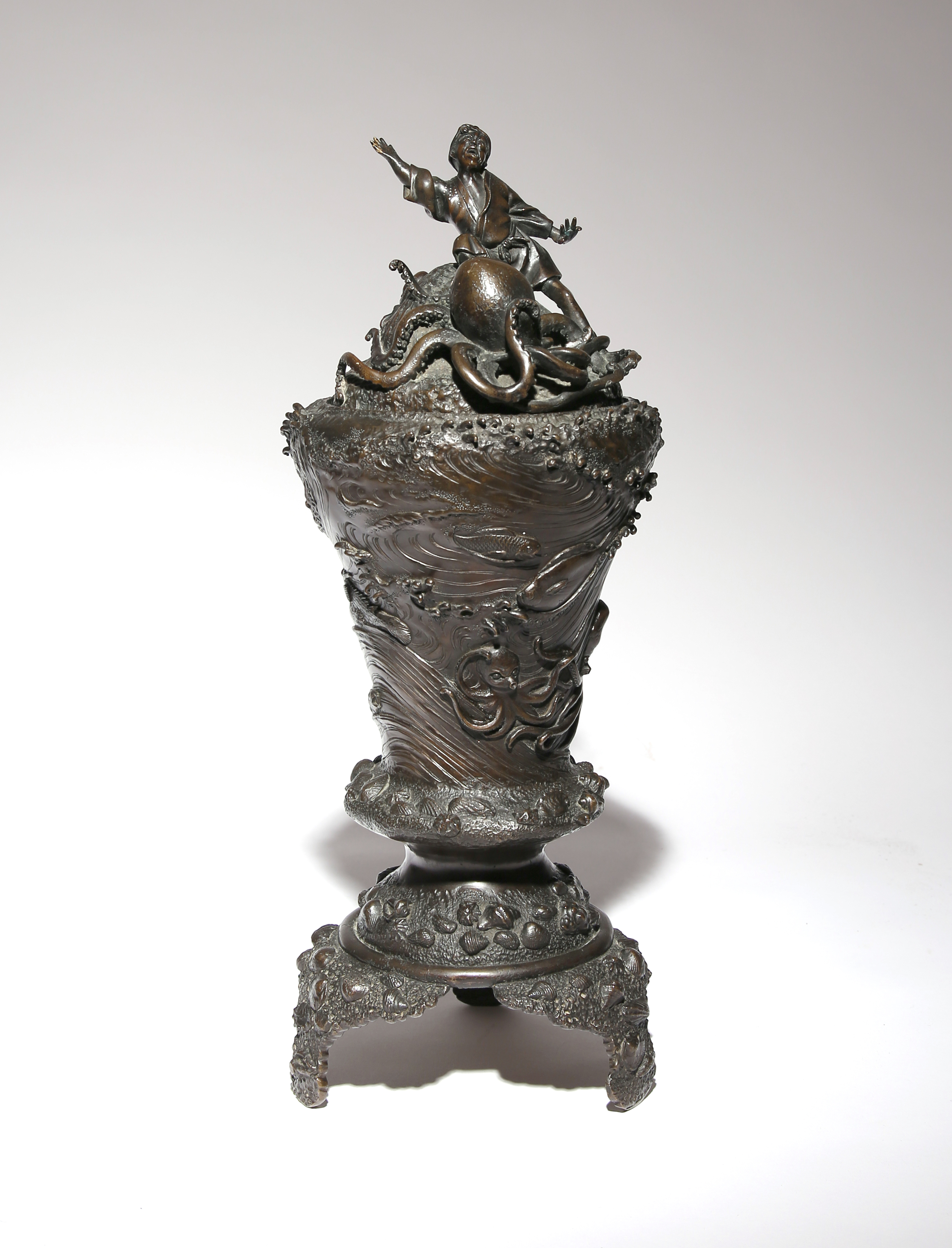 Of tall baluster form and raised on thee shaped feet, the cover cast as a distraught fisherman being attacked by sea creatures, a large octopus wrapping its tentacles around his left leg whilst tickling his foot, the body of the vase with many fish and further octopuses, the lower part depicting a bed of seashells, 47cm overall. (2)