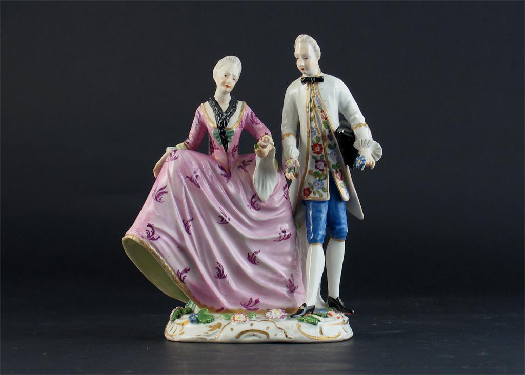 A F model of a lady and gentleman, he holds a tricorn beneath his arm while his companion wears a pink crinoline dress, each carry flowers, blue 'F' mark. Minor repairs. Mid 18th century, 16.5cm.