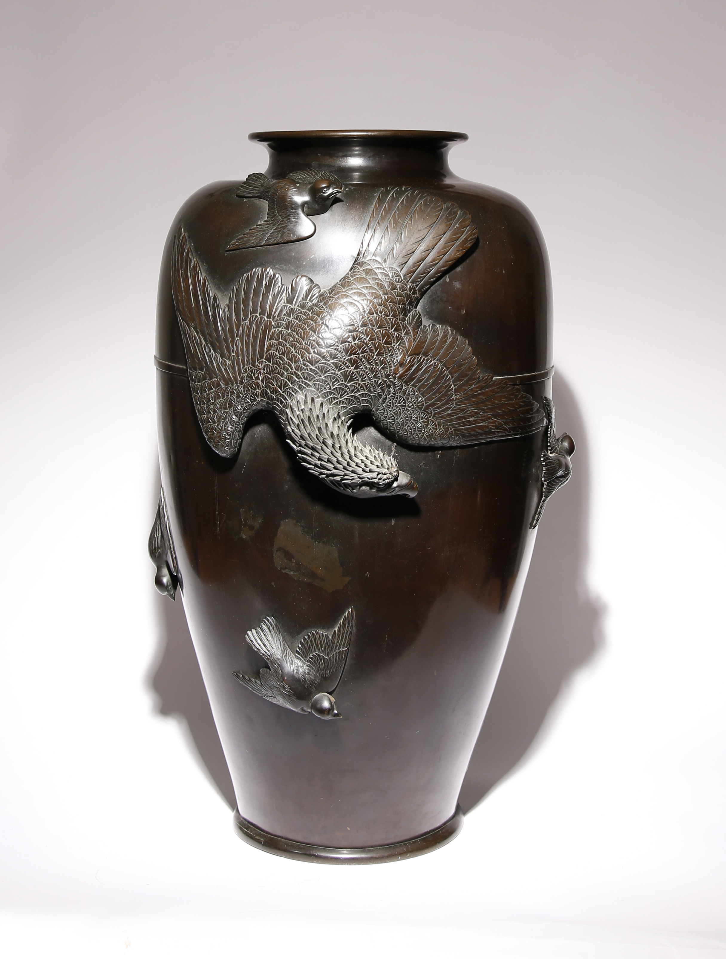 The impressive baluster body decorated with a large bird of prey in flight, five smaller chidori birds surrounding it, the raptor depicted in high relief, the back with a twelve-character mark in a square cartouche, 80cm.