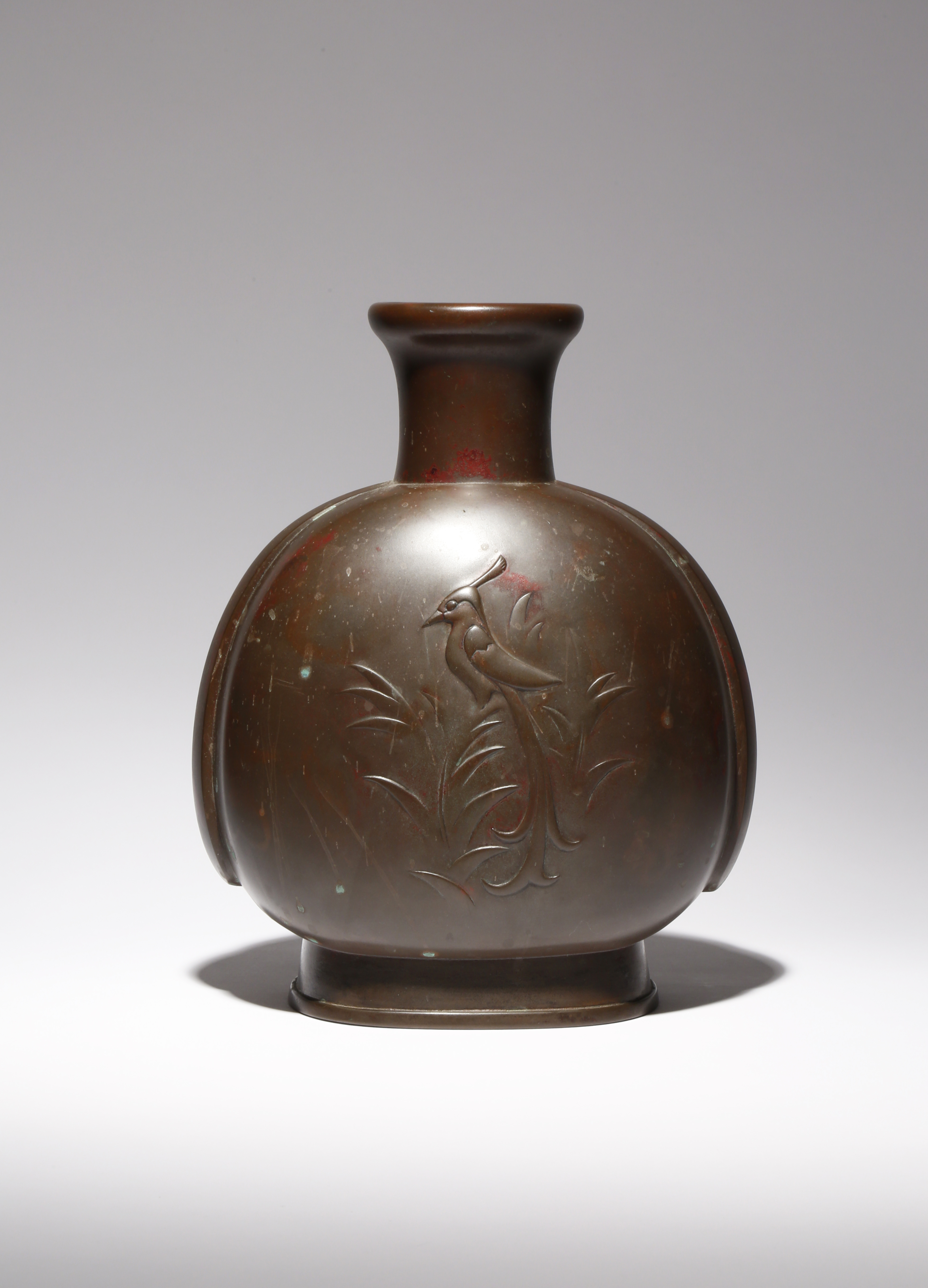 Of flattened circular form, raised on a large foot and with a tall neck rising to a flared rim, the sides decorated with exotic birds with long tail feathers and crests perched amongst foliage, the base signed Kyutaro, 31cm.