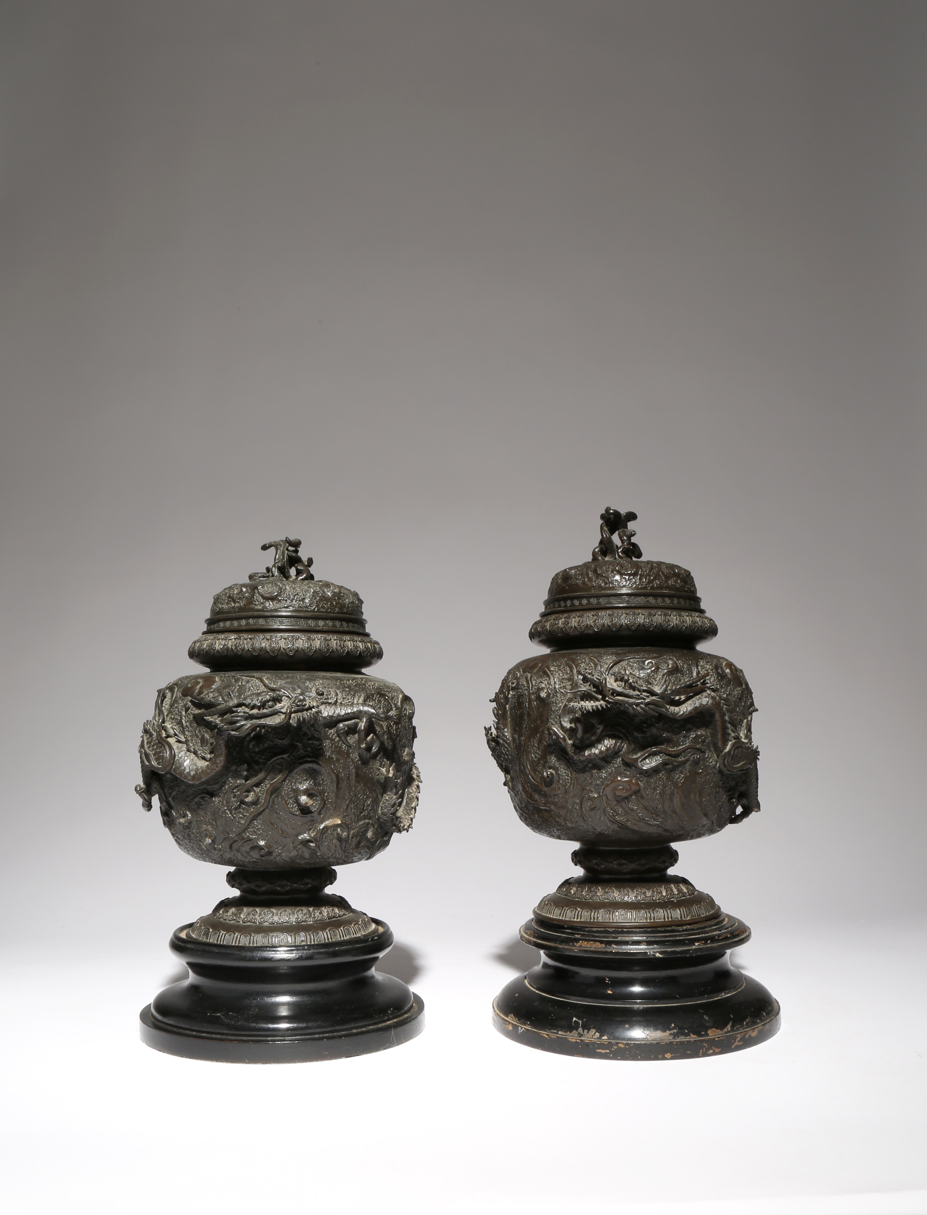 Of bulbous form and each raised on a flaring foot, both vases cast with a dragon in high relief emerging from scrolling clouds and fire wisps, the rims and feet cast with bands of key fret and stylised reishi mushrooms, the covers with spiraling waves extending to become the knops, the insides gilded, both signed in a rectangular cartouche Kimoura Toun, raised on associated wood stands, 35cm overall. (6)