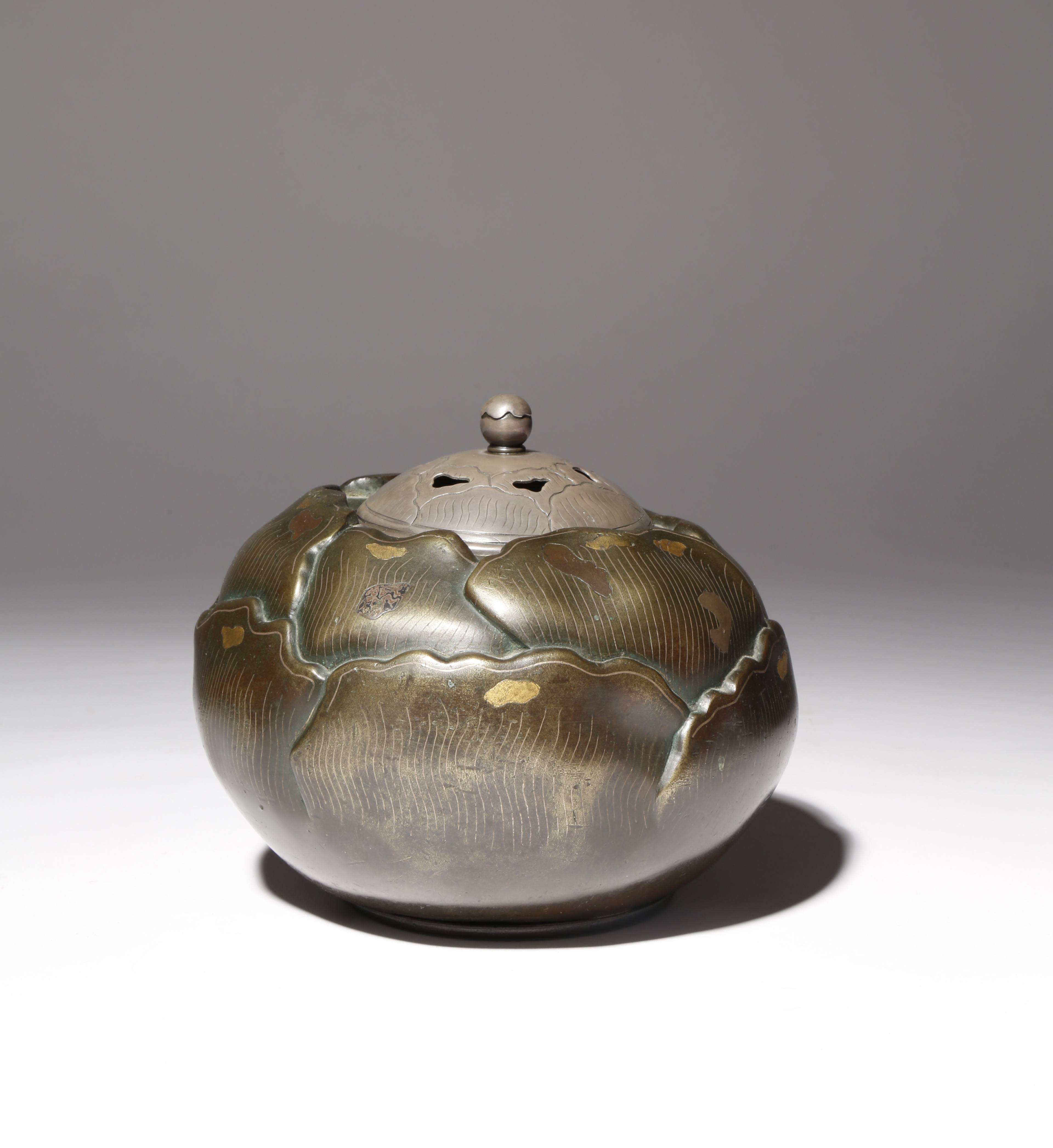 The bulbous body shaped as a peony bud, the petals with striations and areas highlighted in mixed metals including kinzogan, rogin and yamagane alloys, inlaid in honzogan, the decoration of the lid in openwork echoing the shape of the body, with a bud-shaped knop,12cm. (2)
