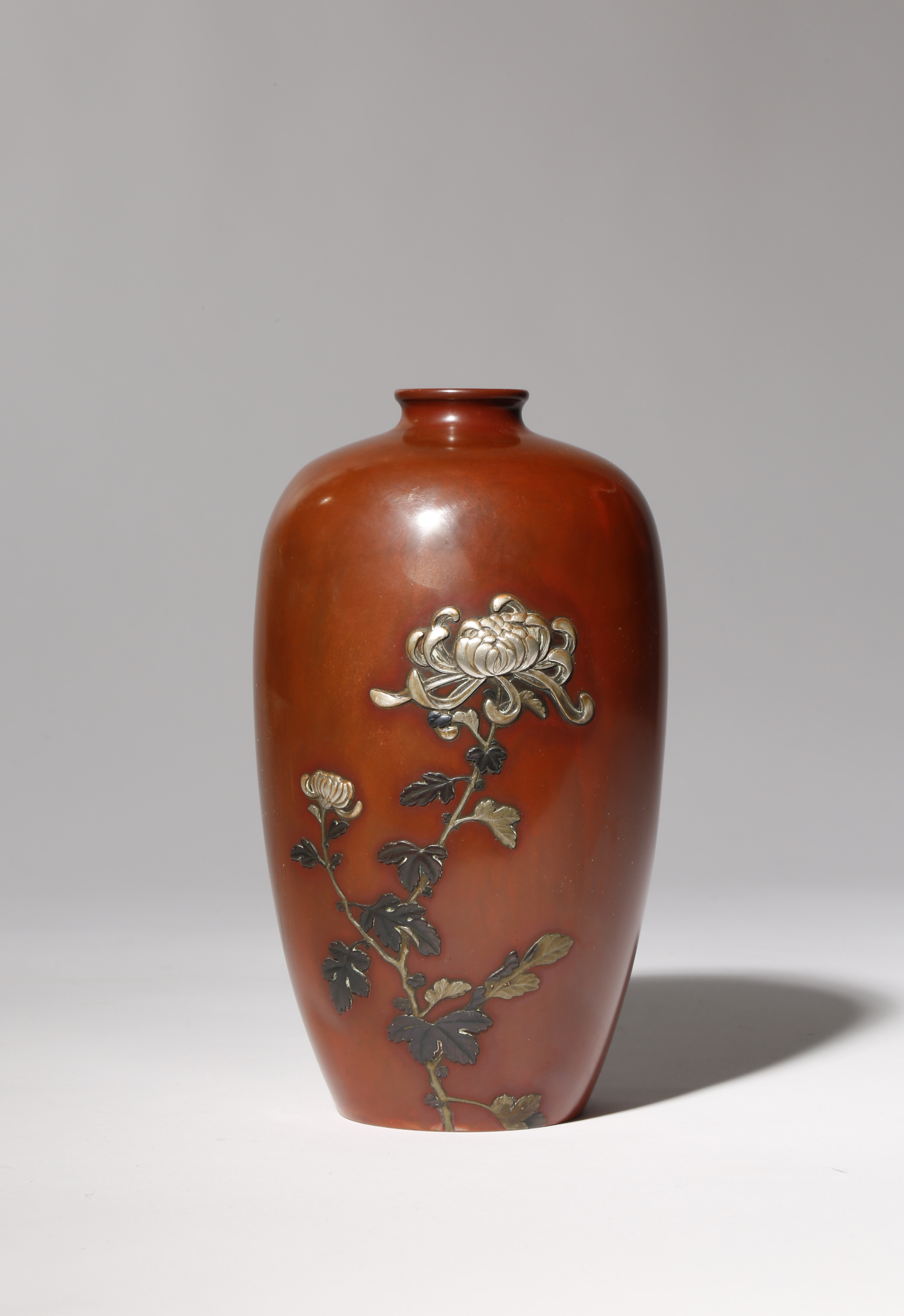 The tall bulbous body decorated with a large chrysanthemum flower and a smaller bud, the blooms, stems and leaves rendered in mixed metals including silver on the russet-brown ground, the base with a mark for the Nogawa Company and with a three character signature to the side, 17.5cm.