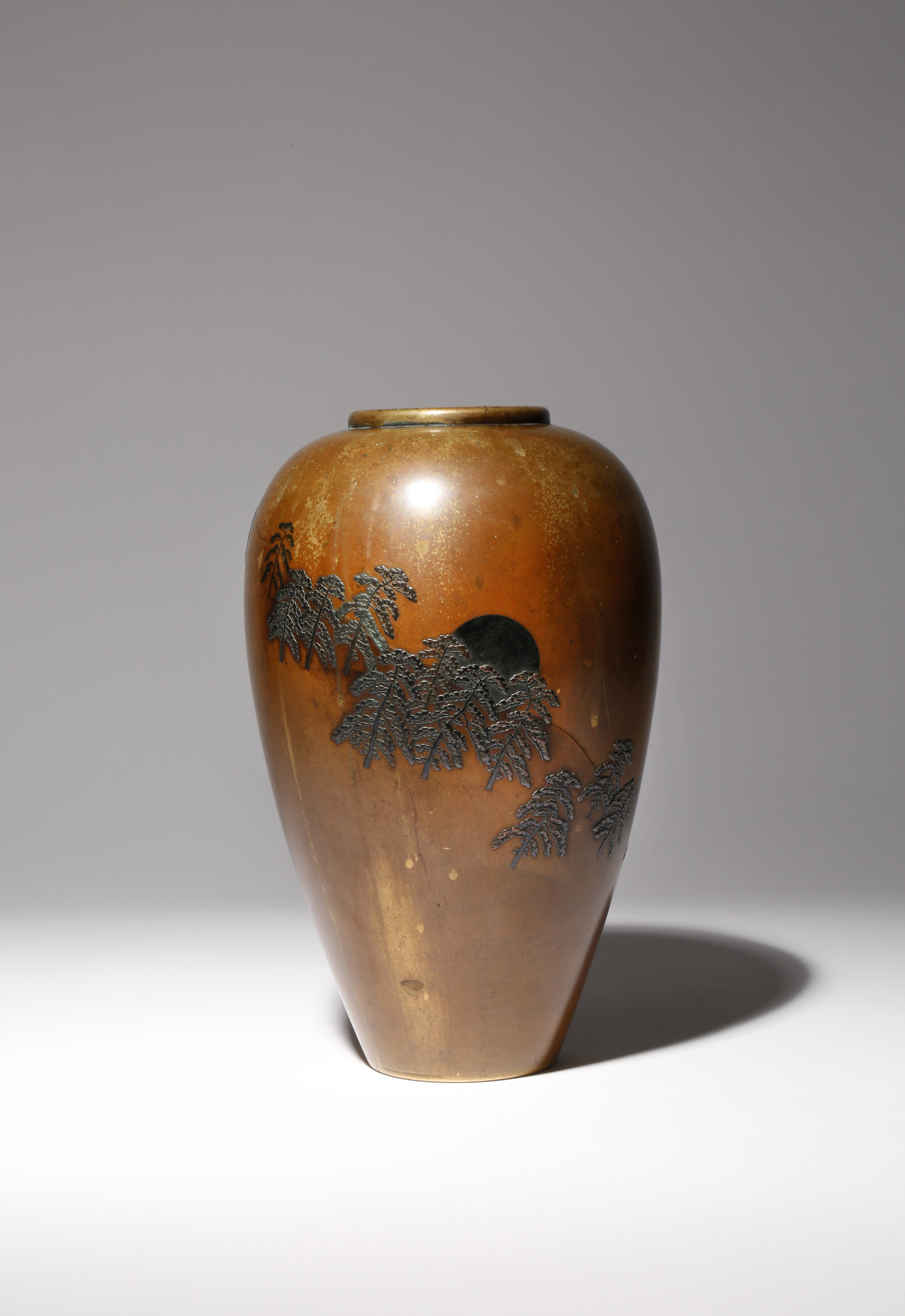 Of tall baluster shape, the body decorated with a continuous design of many pines on the slope of a hill and with a full moon emerging from behind them, the trees rendered in shakudo inlays in low relief and the celestial body in silver, all on the mottled russet-brown ground, the base with a seal for Jomi sei, 25cm.
