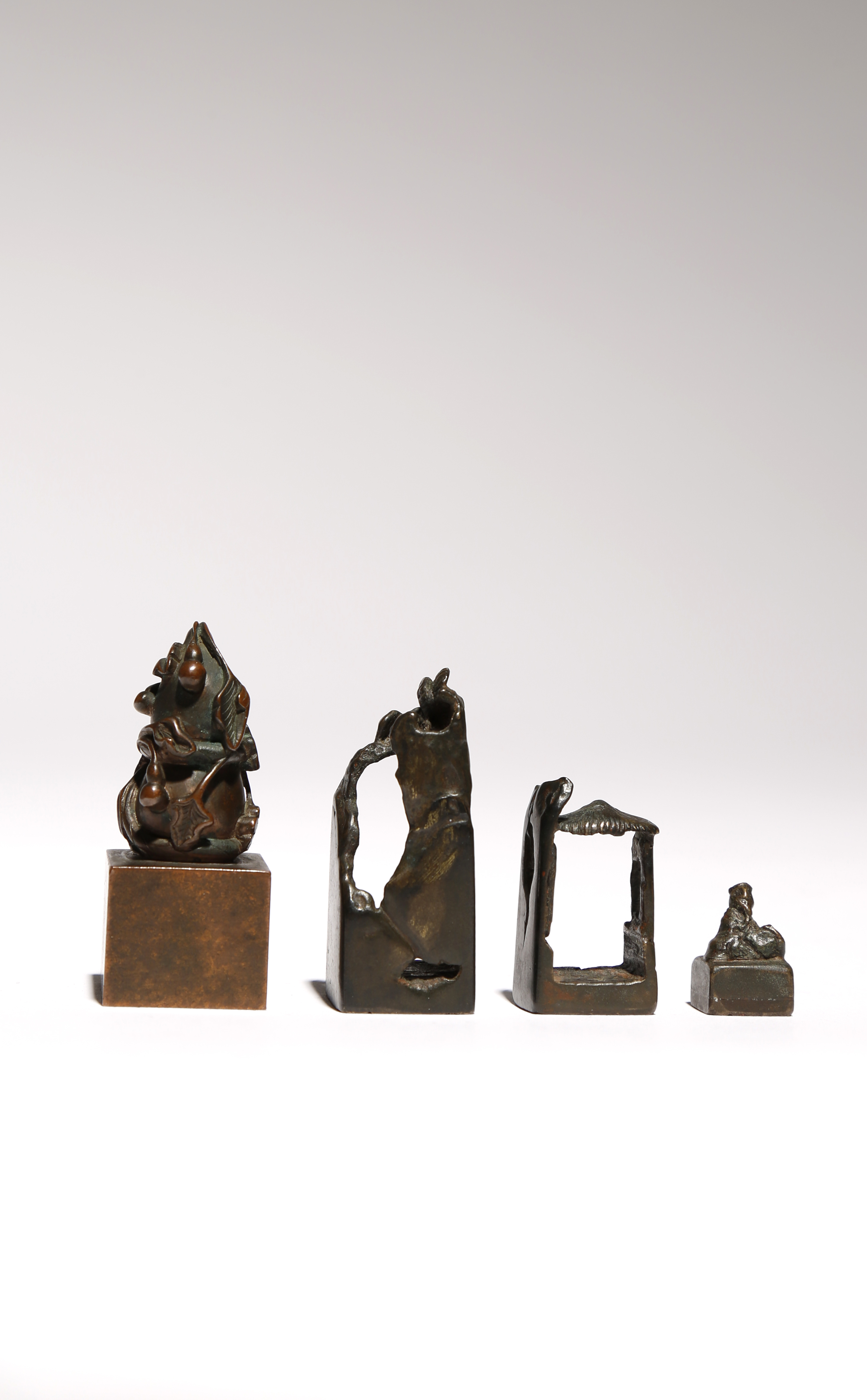 The first in three parts fitting inside each other, modelled as a sage seated in a pavilion beneath a rocky outcrop from which grow pines, with some remnants of gilt; all three matrices cut with characters, one inscribed Kihan Seshin (a retainer at the Kishu domain) and Kuki Shi In (seal of Kuki, a noble name); the other seal shaped as a double gourd raised on a square plinth, with scrolling tendrils and smaller fruits growing from the stalk, the matrix left uncut; 4.7cm and 4.3cm respectively. (4)