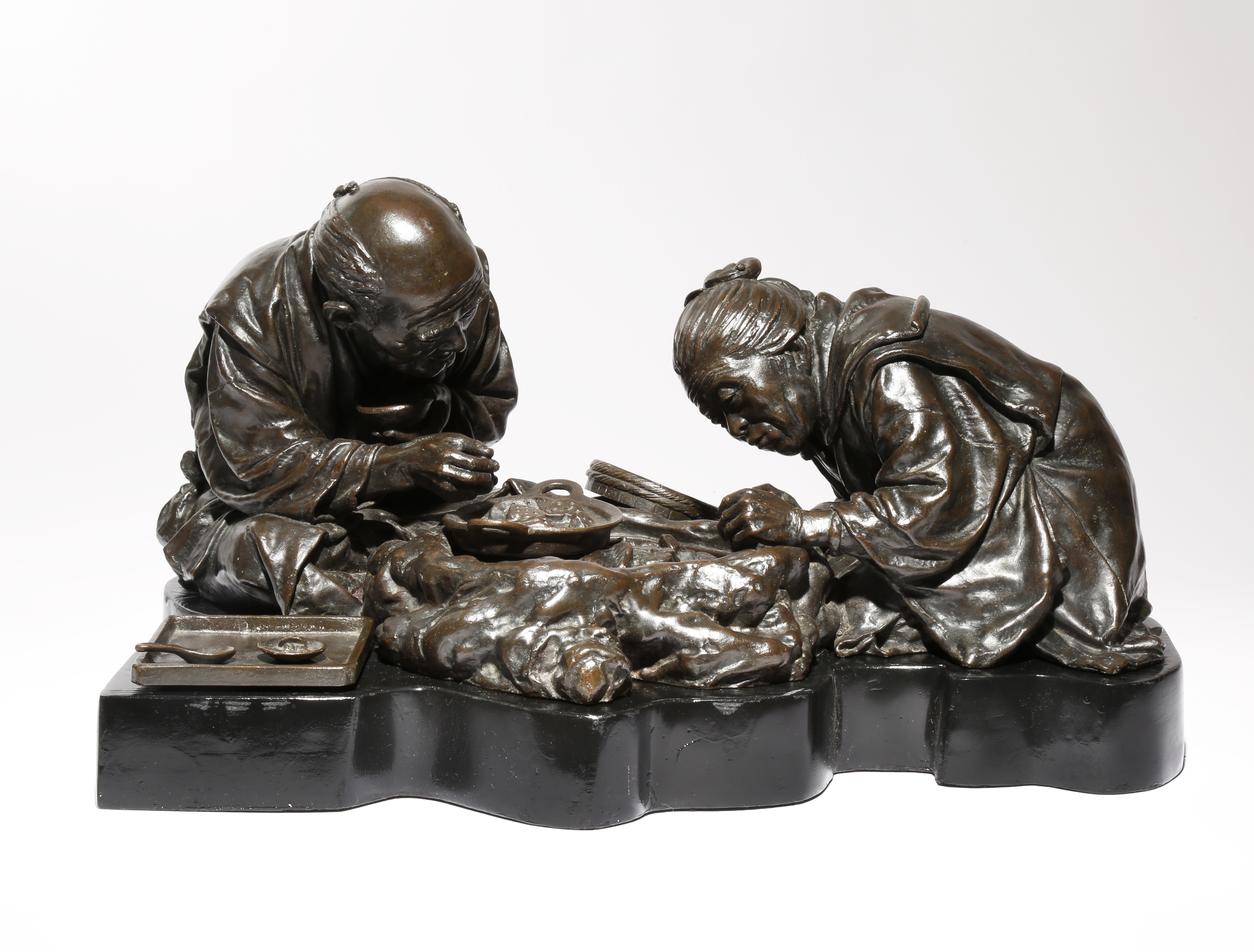 Cast as an elderly couple preparing a meal, the woman leaning over the hearth whilst blowing on the hot coals, her companion sprinkling salt over the cooking dish, the simmering concoction containing lotus roots and a fish head; a loose square tray to his side with cooking implements, signed to the back in a square cartouche Nihon Tokyo Udagawa Kazuo sei (Japan Tokyo made by Udagawa), raised on a fitted lacquered wood stand, 52.5cm max. (3)