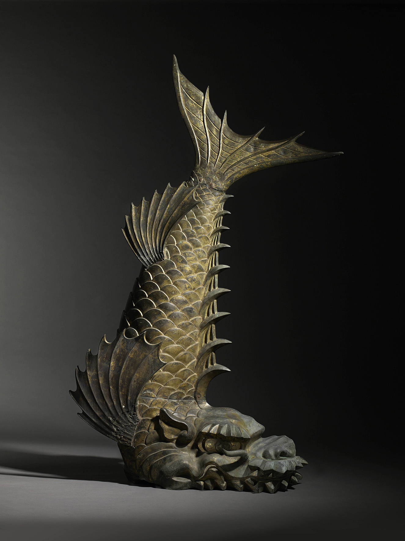 The massive dragon-fish depicted with its tail pointing upwards towards the sky, its dragon head with bushy eyebrows and long whiskers, the carp-like body modelled with four large pectoral fins and crisp scales, a spiny dorsal fin and with a flared tail, with remnants of gilt, 160cm.