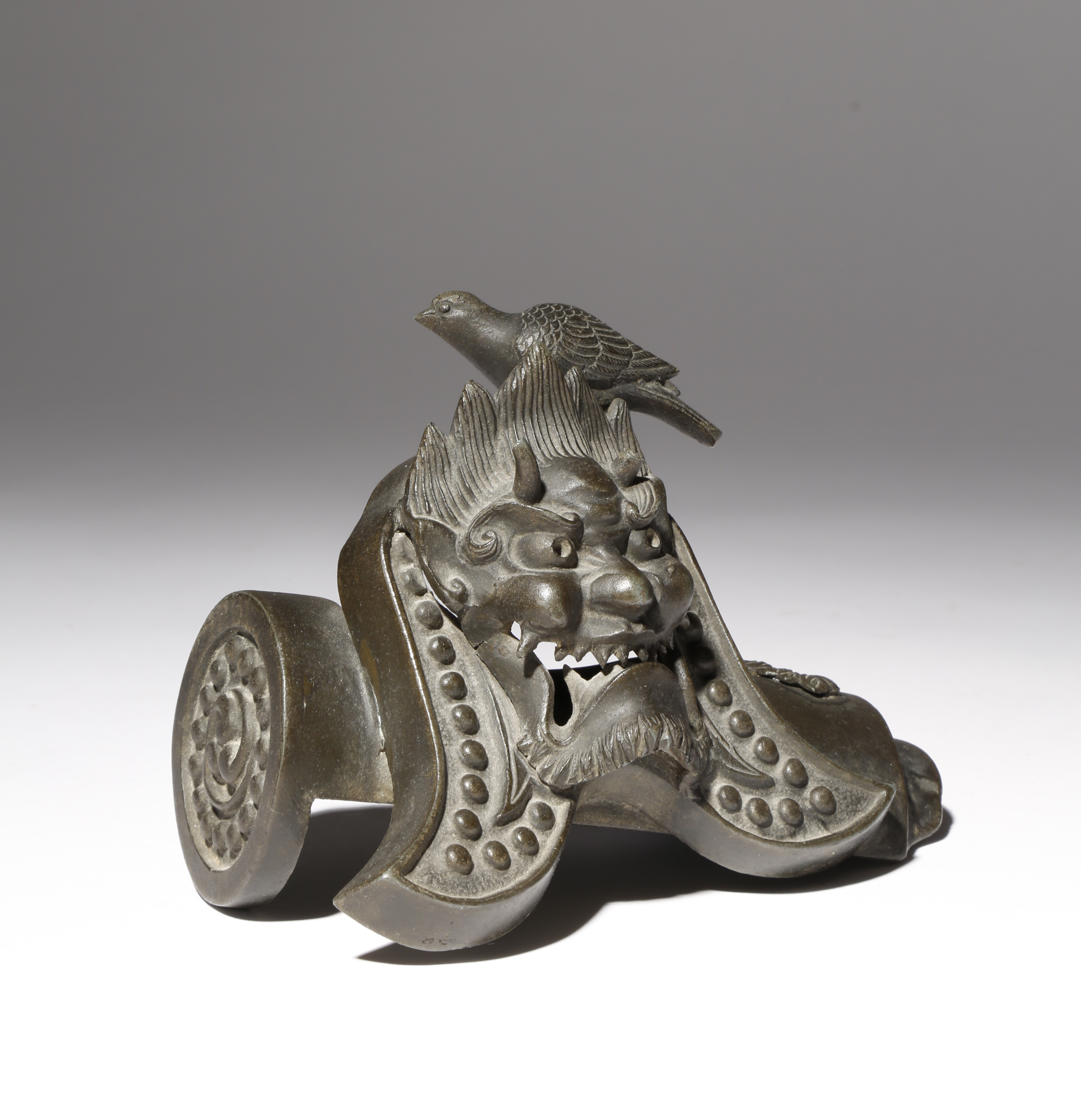 The bird perched on an oni-gawara, a traditional roof tile of cylindrical shape with a demon-shaped finial, the grimacing figure with sharp fangs and short horns, the back with ivy leaves and tendrils and with mitsudomoe comma-like swirl symbols to the side, 14.3cm.