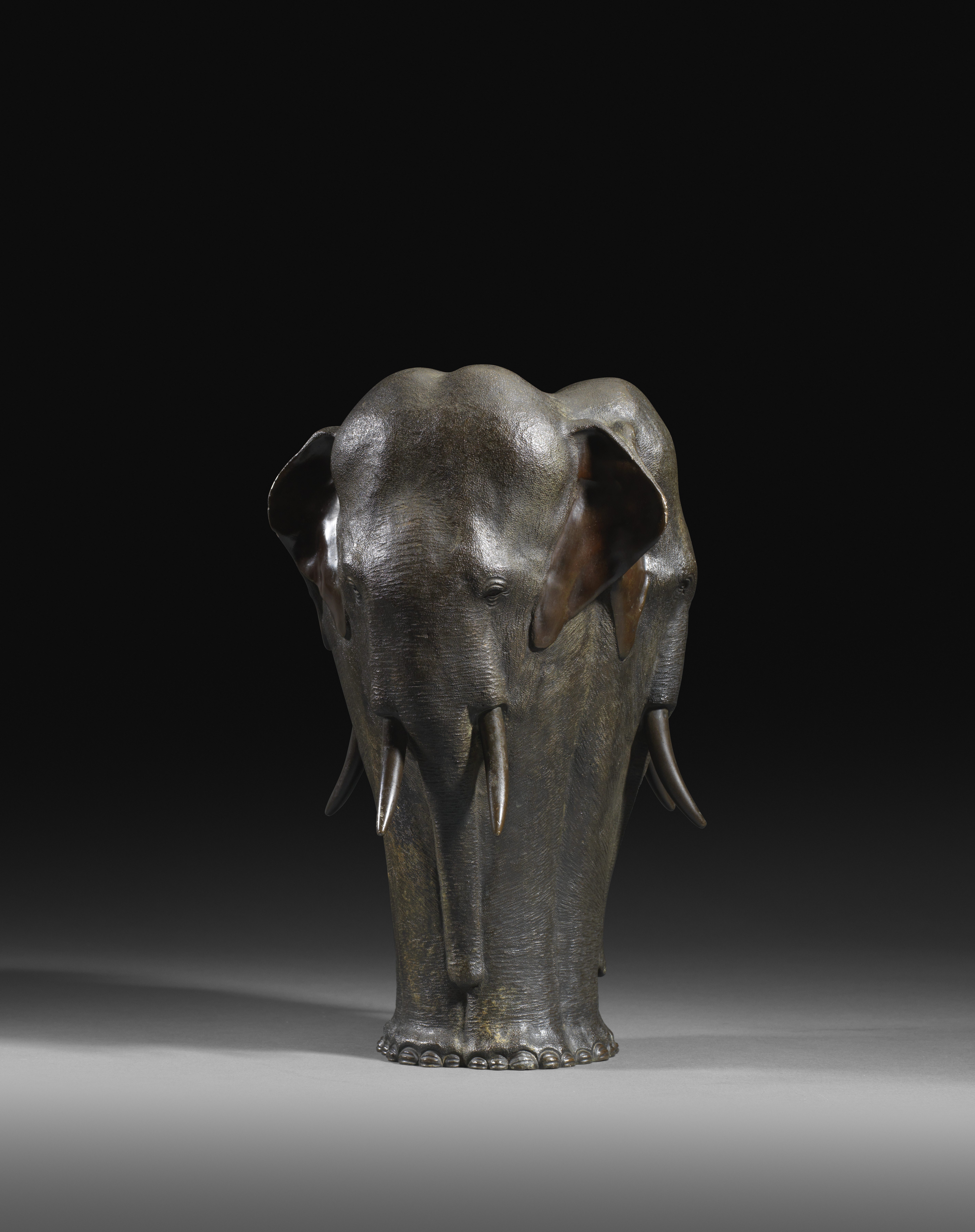 The tall baluster body cast as three elephants, the roughness of their skin naturalistically rendered, their tusks and ears in high relief and with a warm reddish patina, the base with a seal mark reading Seiya sei for Genryusai Seiya, 31.5cm.