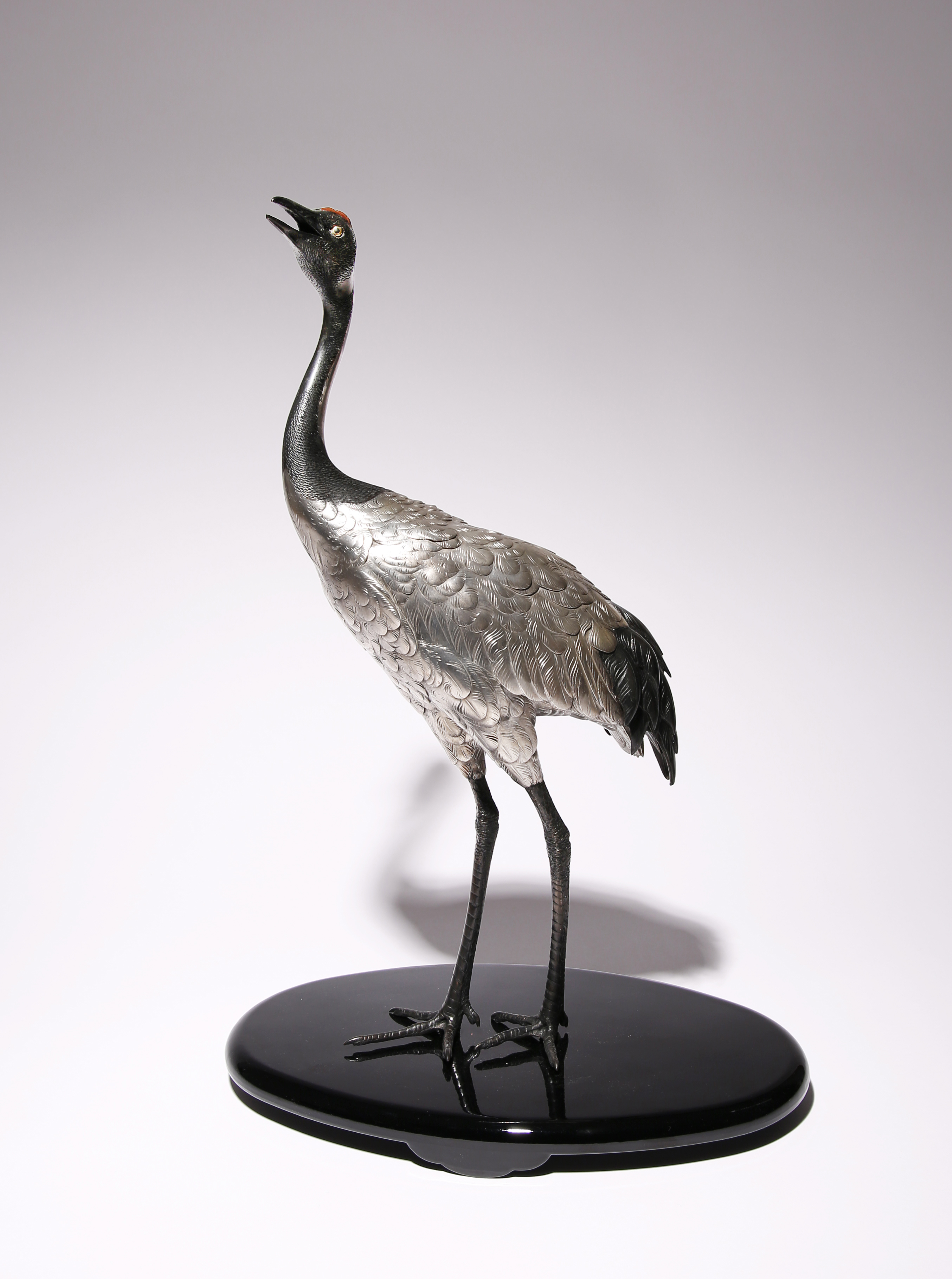 A JAPANESE SILVERED-BRONZE MODEL OF A CRANE BY MASAAKI