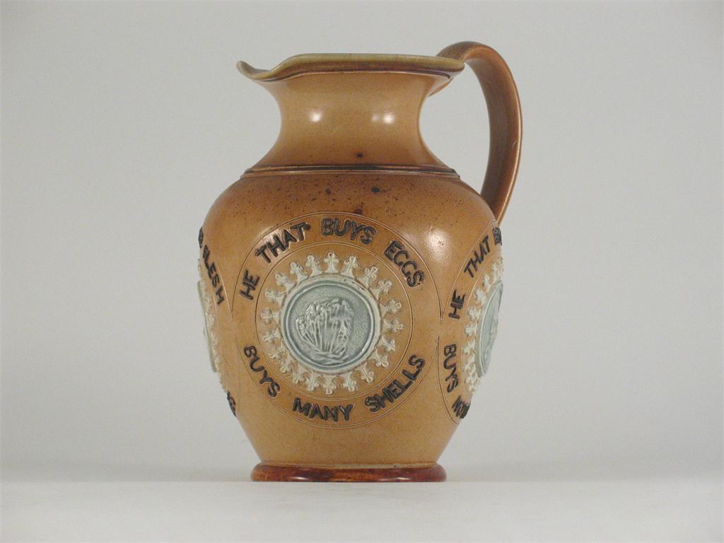 A Doulton brown stoneware jug, decorated with celadon portrait medallions encircled by mottos, impressed marks, dated 1883, 19.5cm.