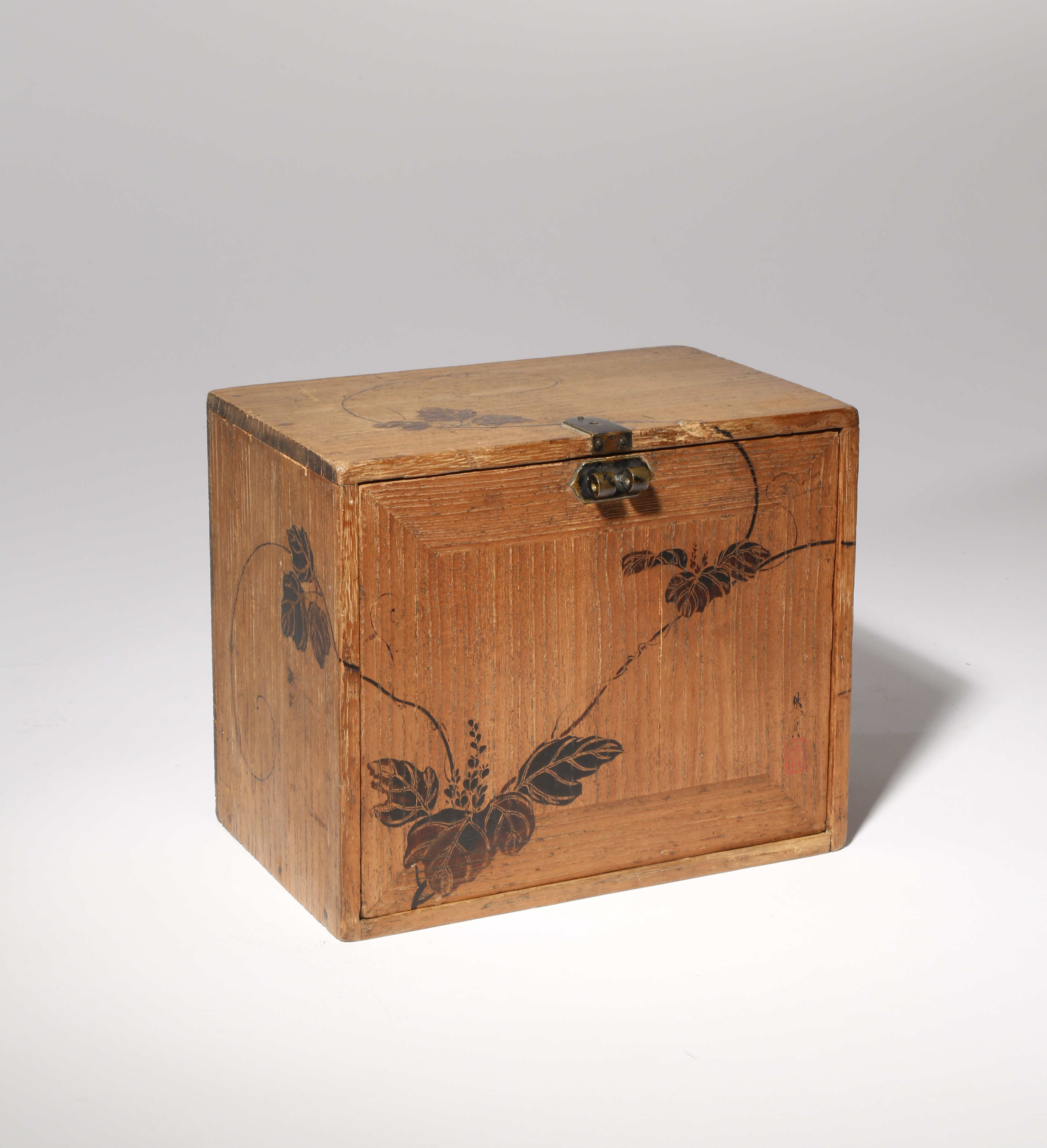Possibly cedar wood, the box made for holding utensils for the tea ceremony, the door and sides decorated with paulownia flowers, leaves and scrolling tendrils in russet-brown and black lacquer, the interior with two inner compartments and a small drawer above, the door with two characters reading Zeshin and with a red seal underneath for Shin, after Shibata Zeshin (1807-1891), 16.6cm x 20cm x 12.6cm, (3)