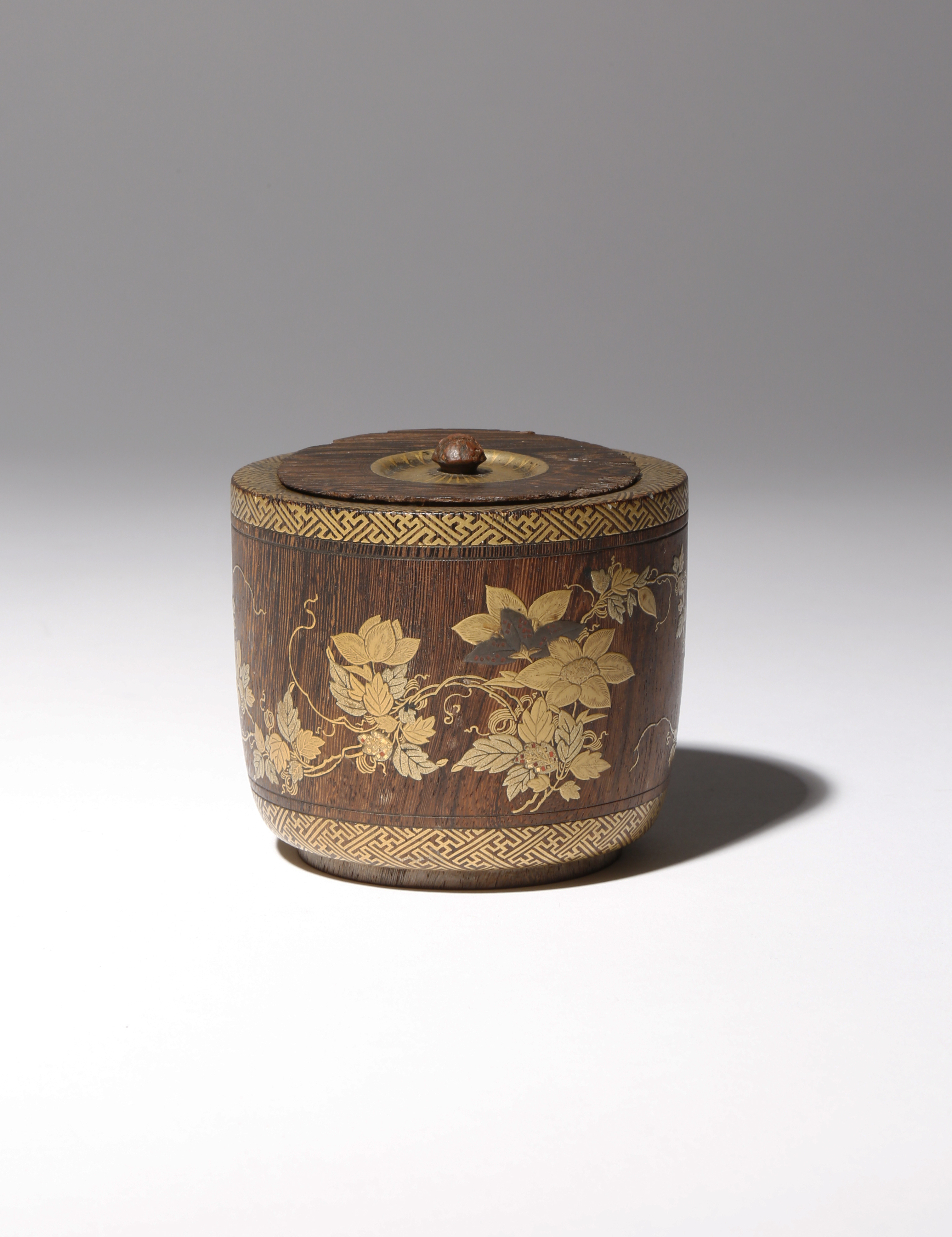The tea caddy with a cylindrical body raised on a short foot, delicately painted with a continuous band of tokeiso (passion flowers), scrolling tendrils and leaves rendered in gold and silver takamaki-e and kirikane, with bands of brocade designs above the foot and to the rim, the lid with a chrysanthemum flowerhead encircling the circular knop, the inside in black lacquer, 7cm. (2)