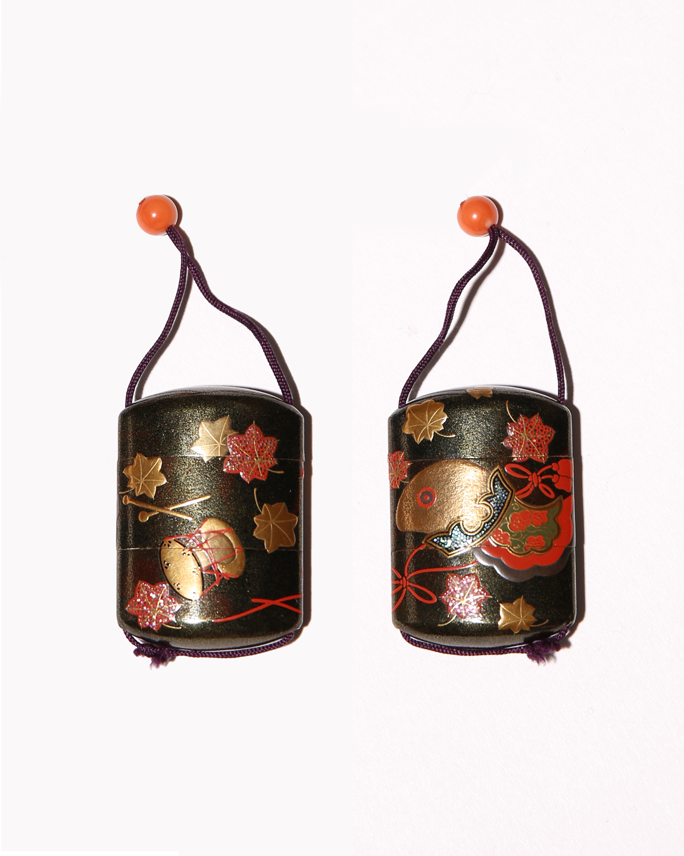 The delicate body rendered in gold and red hiramaki-e, kirikane and takamaki-e on the nashiji ground and with inlays in aogai (abalone shell); decorated to one side with a taiko drum amongst falling maple leaves and the reverse with a torikabuto, an elaborate headdress with long tassels, also surrounded by autumn leaves; suspended on a silk cord and with a small coral ojime, 4.5cm. (3)