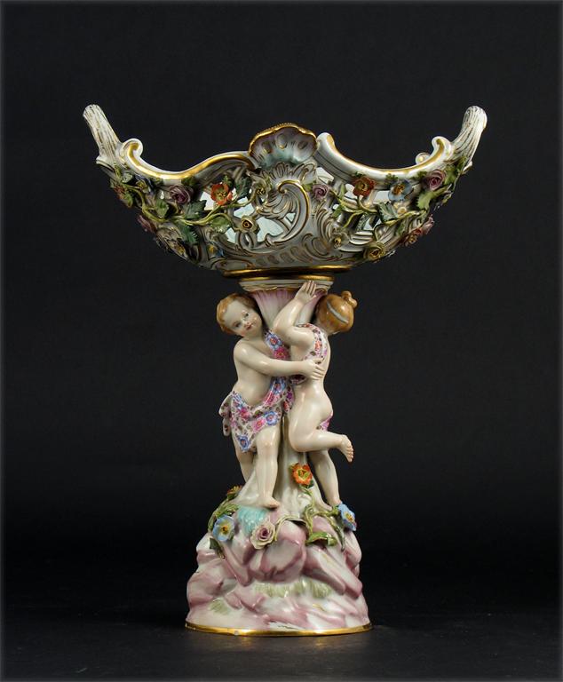 A Meissen centrepiece, with a reticulated basket applied with flowers, supported by a young boy and girl on a high rocky base, crossed swords and incised marks. Small chips to the leaves and flowers. 19th century, 31cm.