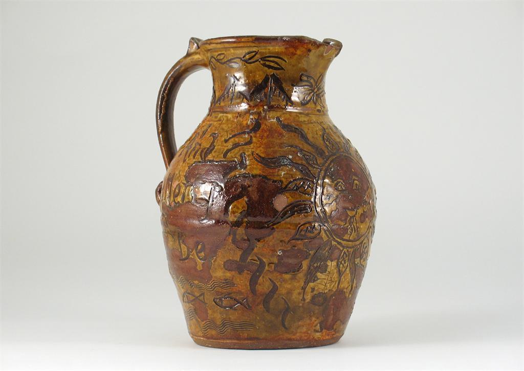 A red stoneware West Country jug, decorated with a treacle glaze and inscribed with a shining sun and the verse 'Come Drink of Me and Merry Be'. Flaking to the glaze. 19th/early 20th century, 24.5cm.
