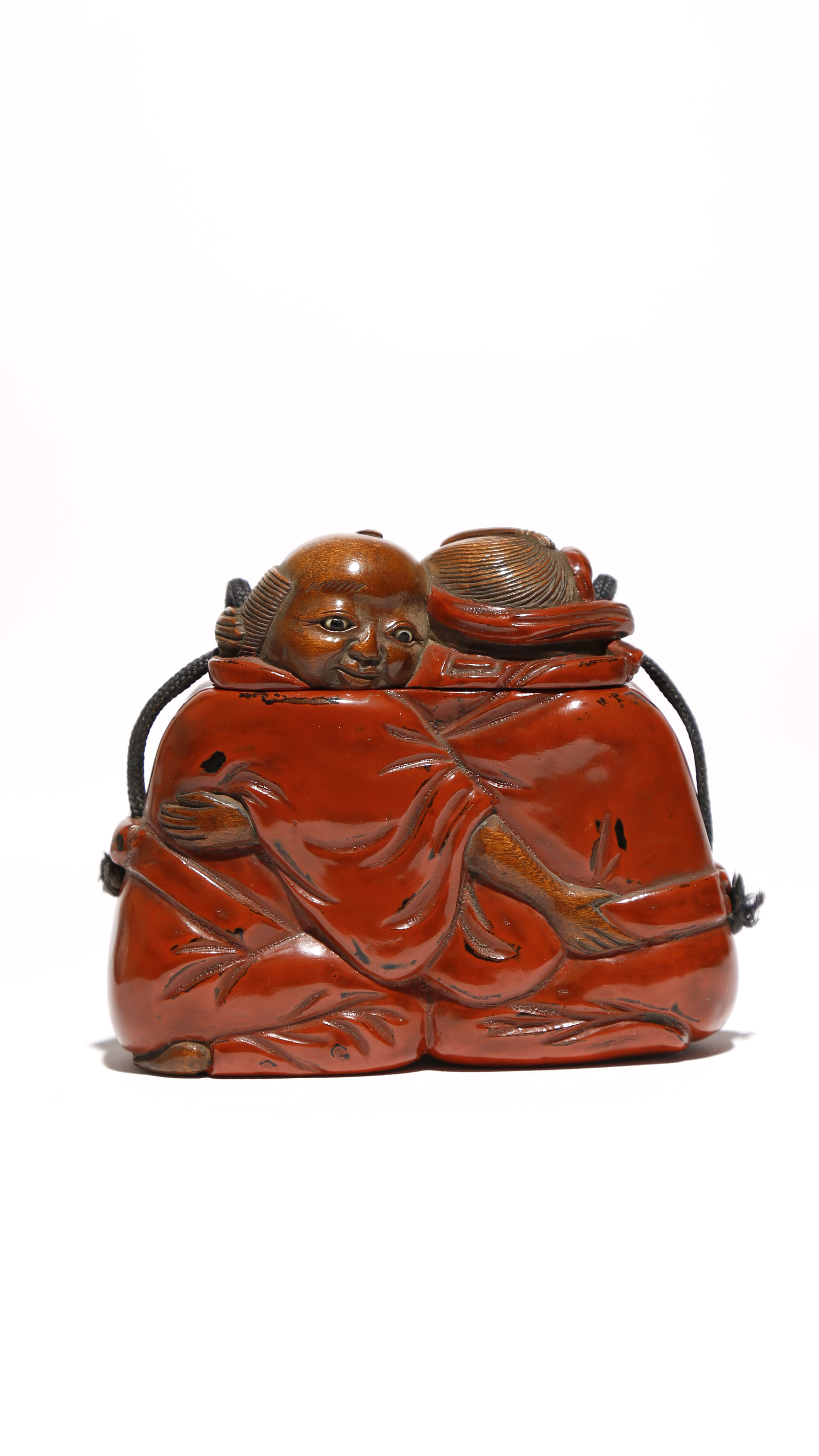 The tobacco box carved as two men wrestling, both kneeling and grasping each other at the waist, each wearing a red lacquer kimono and with their eyes inlaid, their heads forming the lid, 9cm.