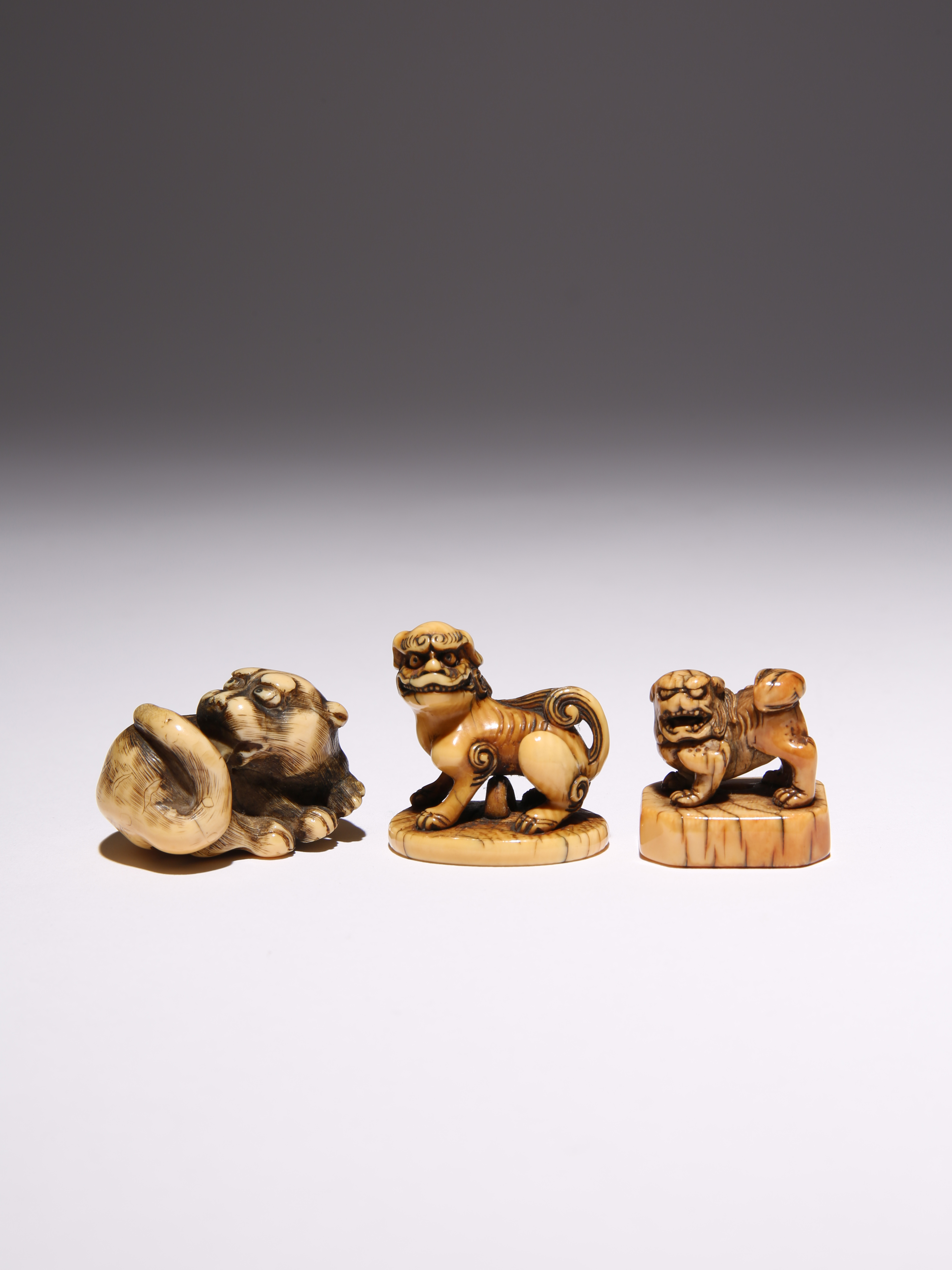 One carved as a reclining tiger licking its back, the other two depicting lion dogs standing on bases, one a seal cut with three characters underneath, the other with a paper collection label reading 'G 232', 4.2cm max. (3)